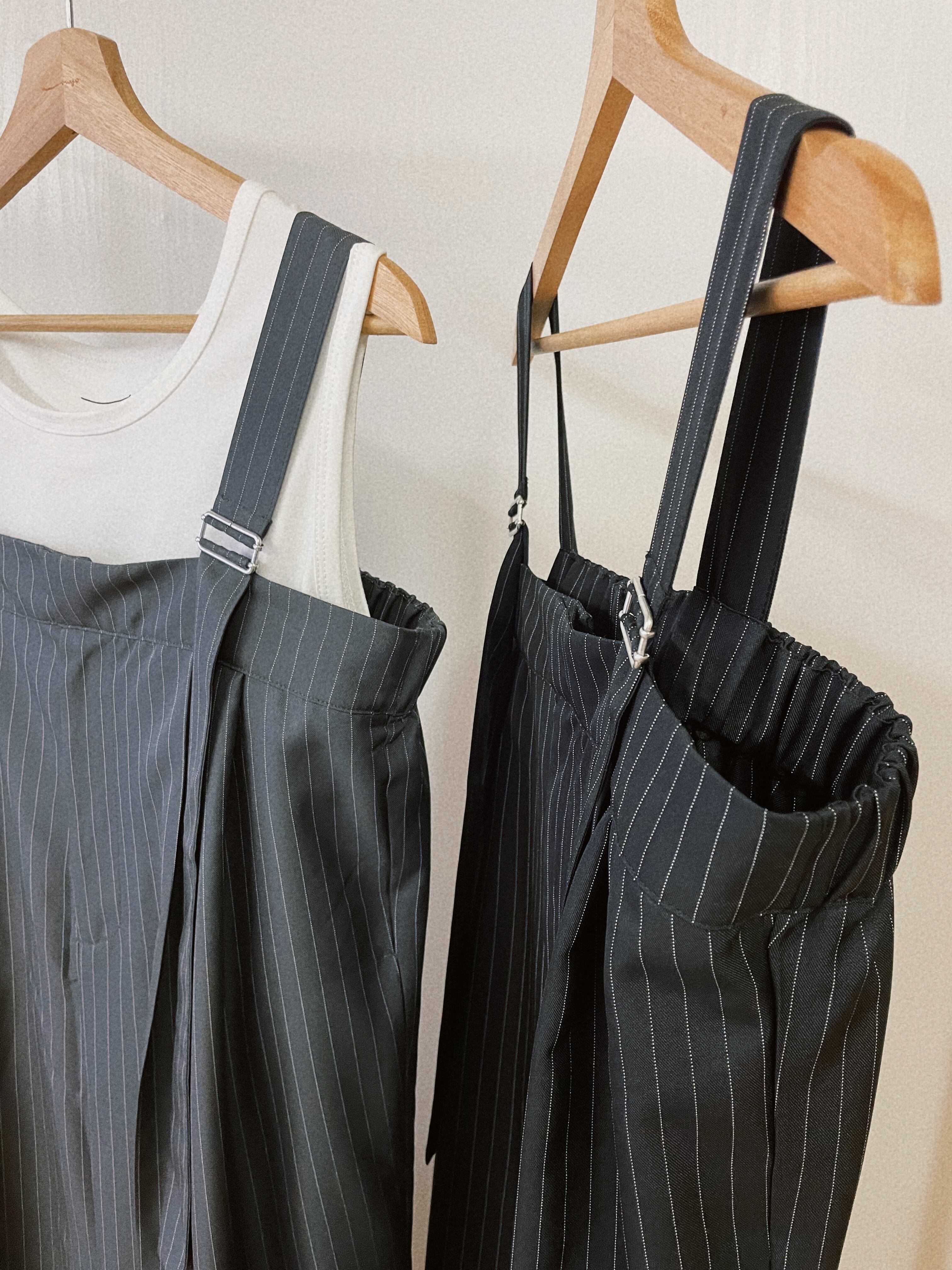 ウエスト周りのたっぷりタックデザインに、ピンストライプデザインのワイドタックサロペット