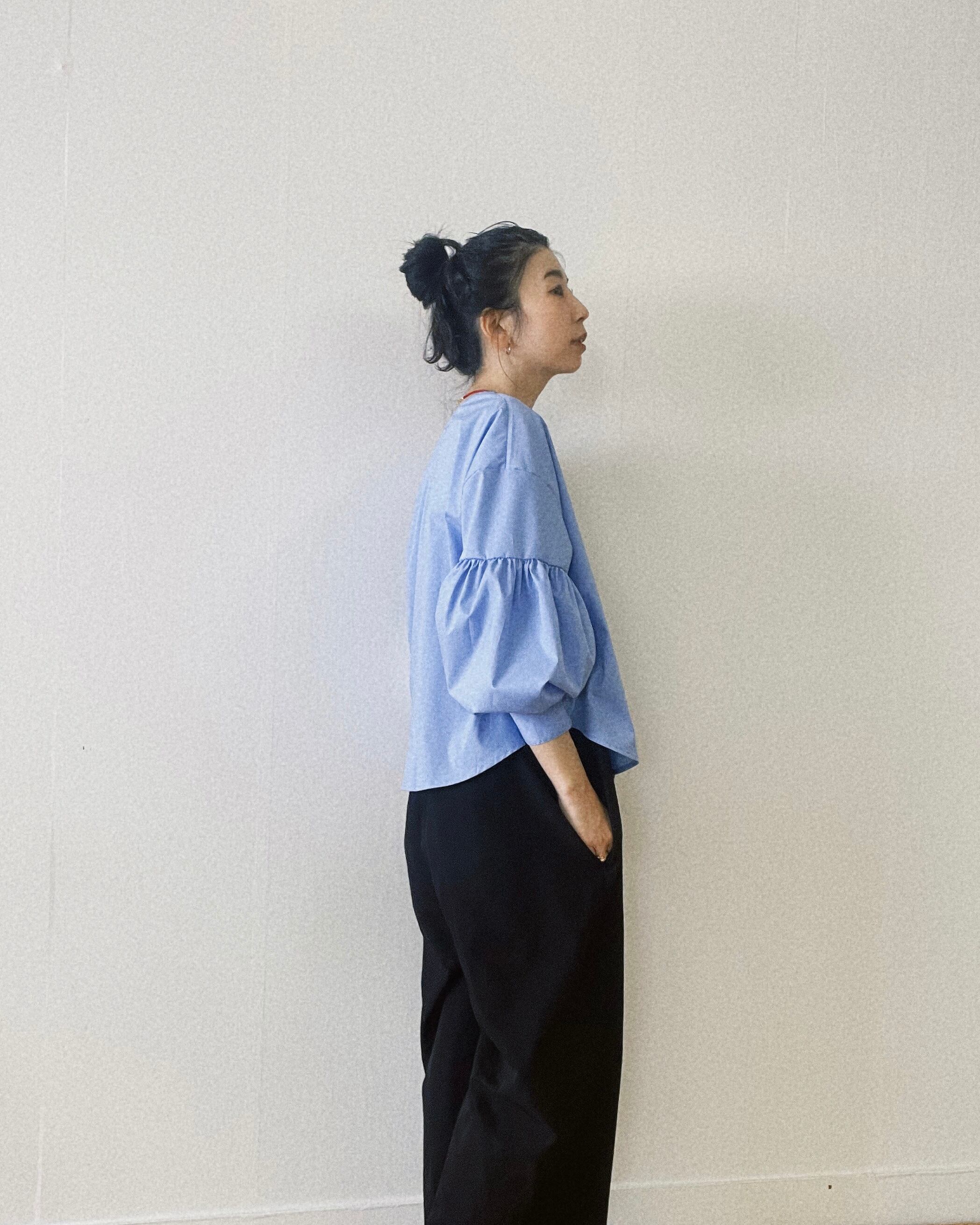 バンドカラーのかっちりしたシャツながら、たっぷりとしたボリューム袖でやわらかい印象に