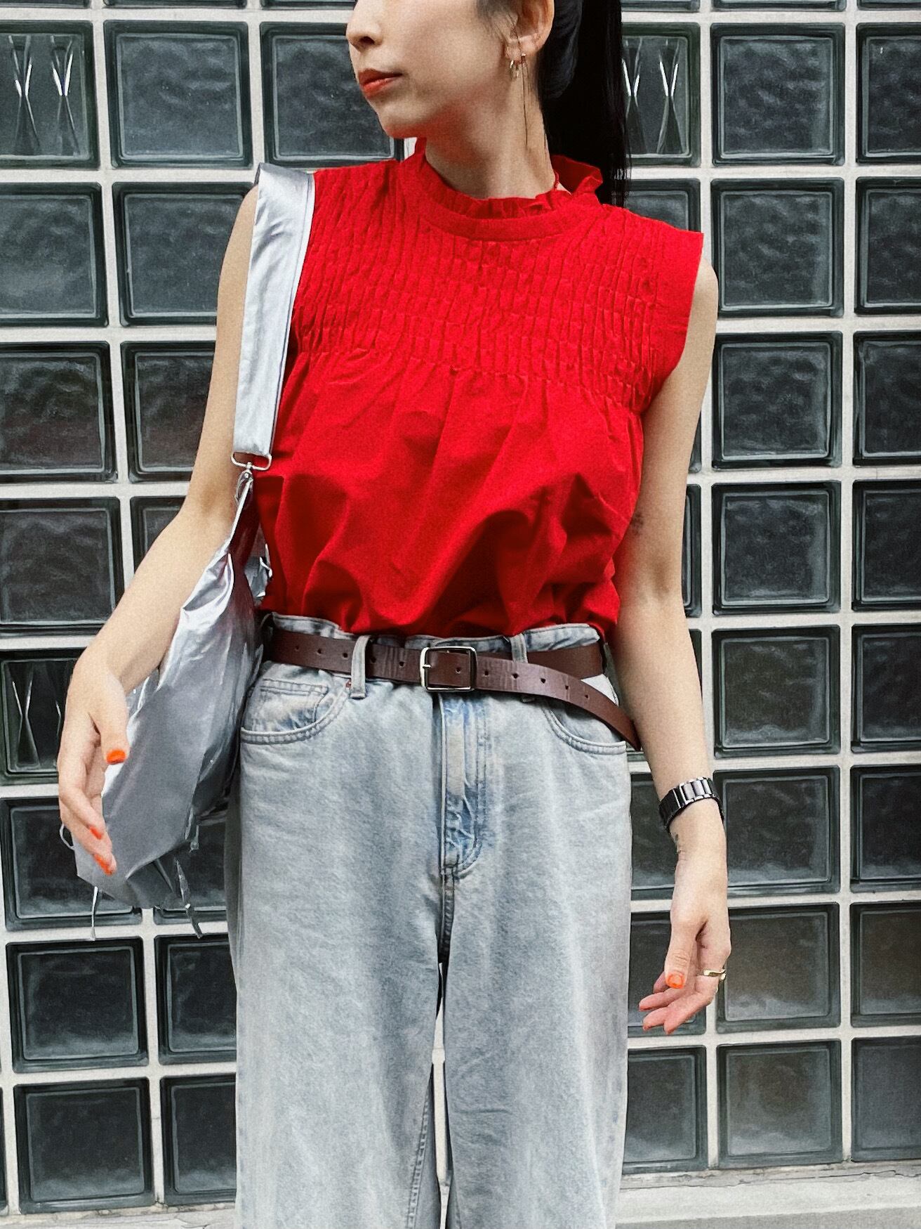 プチフリルのデザインネックがポイントのノースリーブブラウス