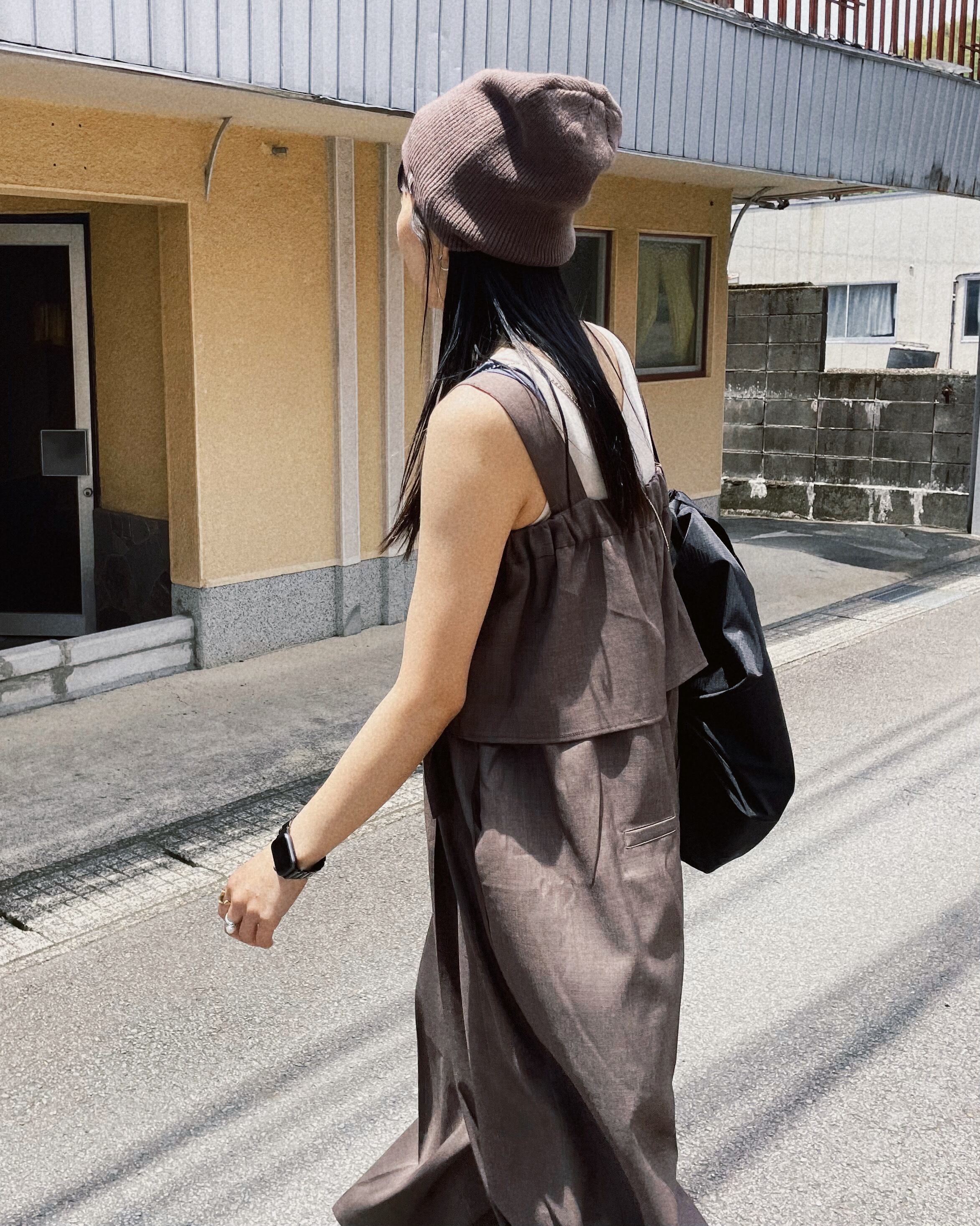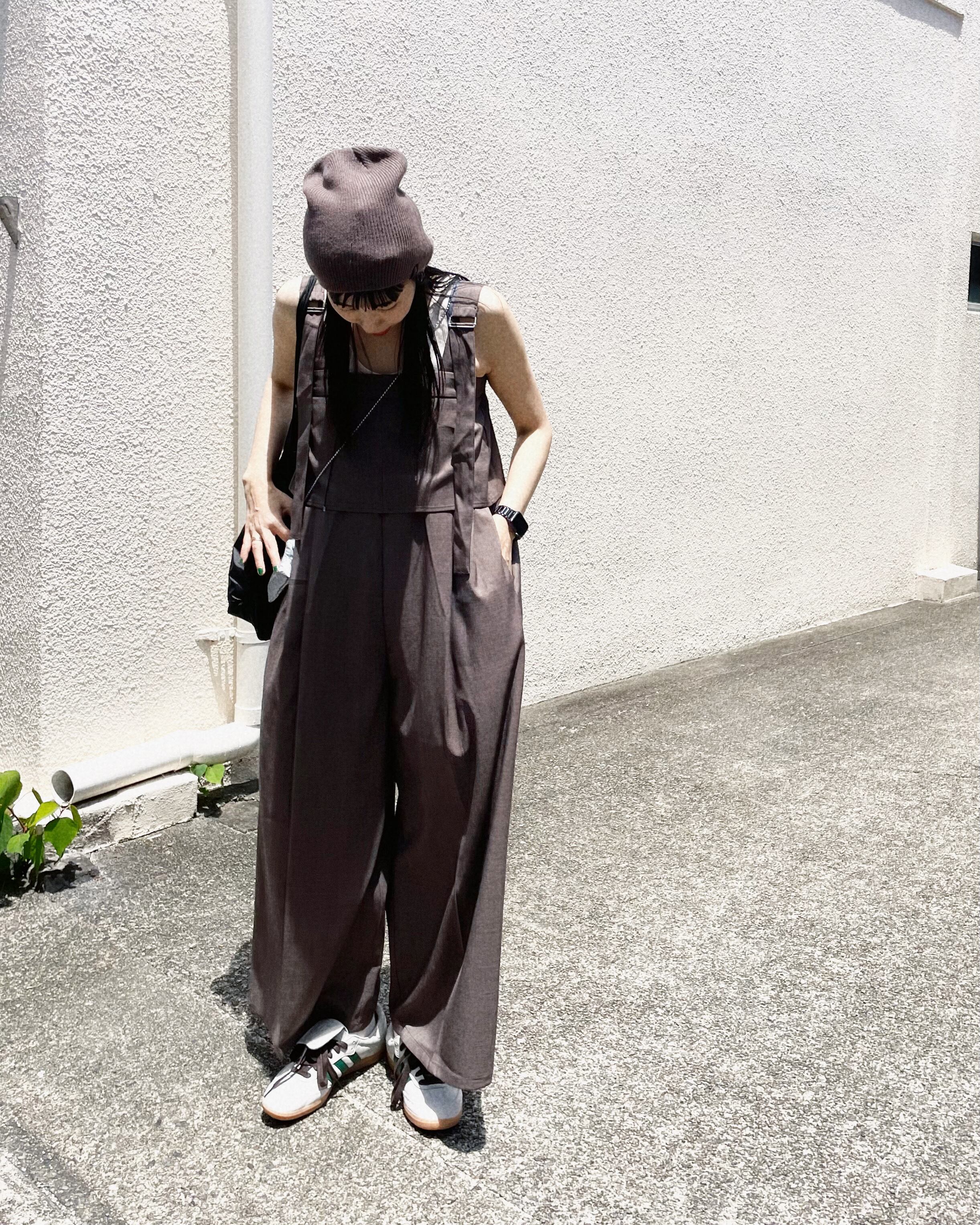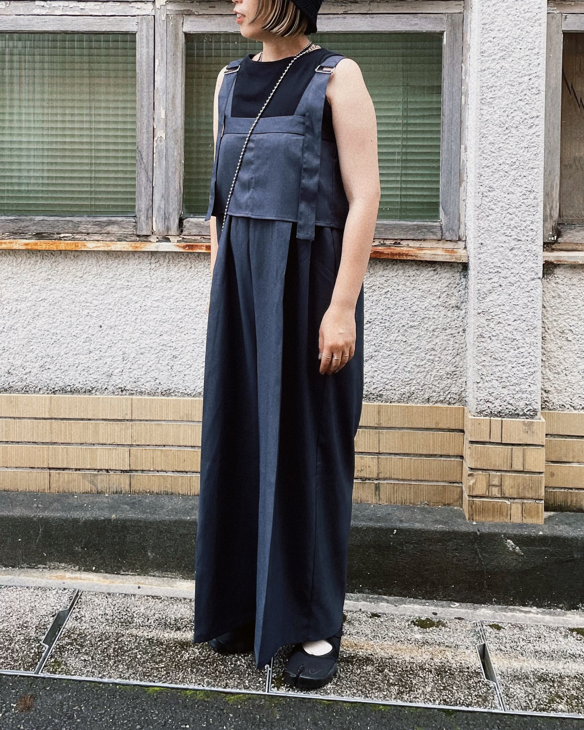胸元のケープデザインが、一癖あるエステルツイルのケープサロペット