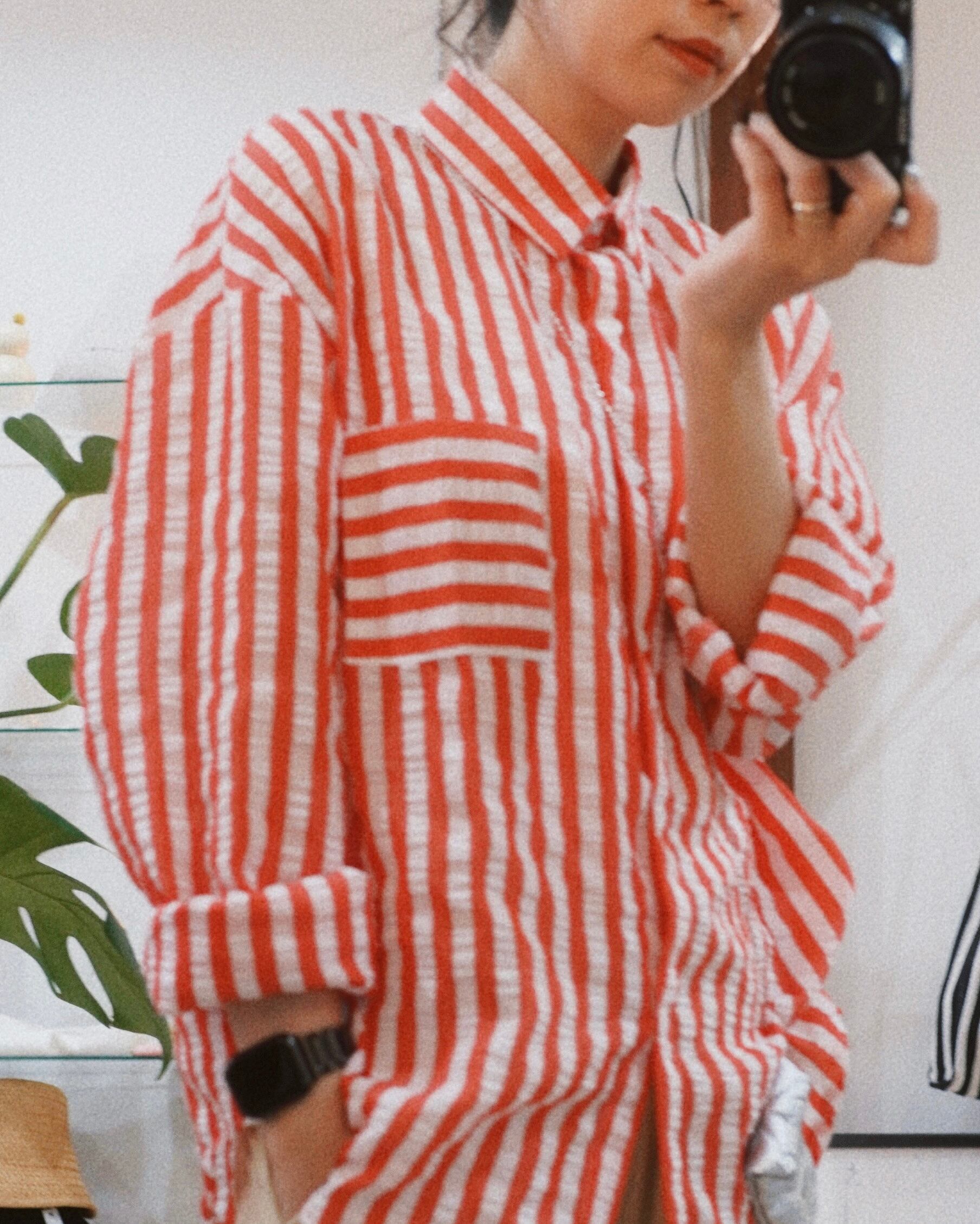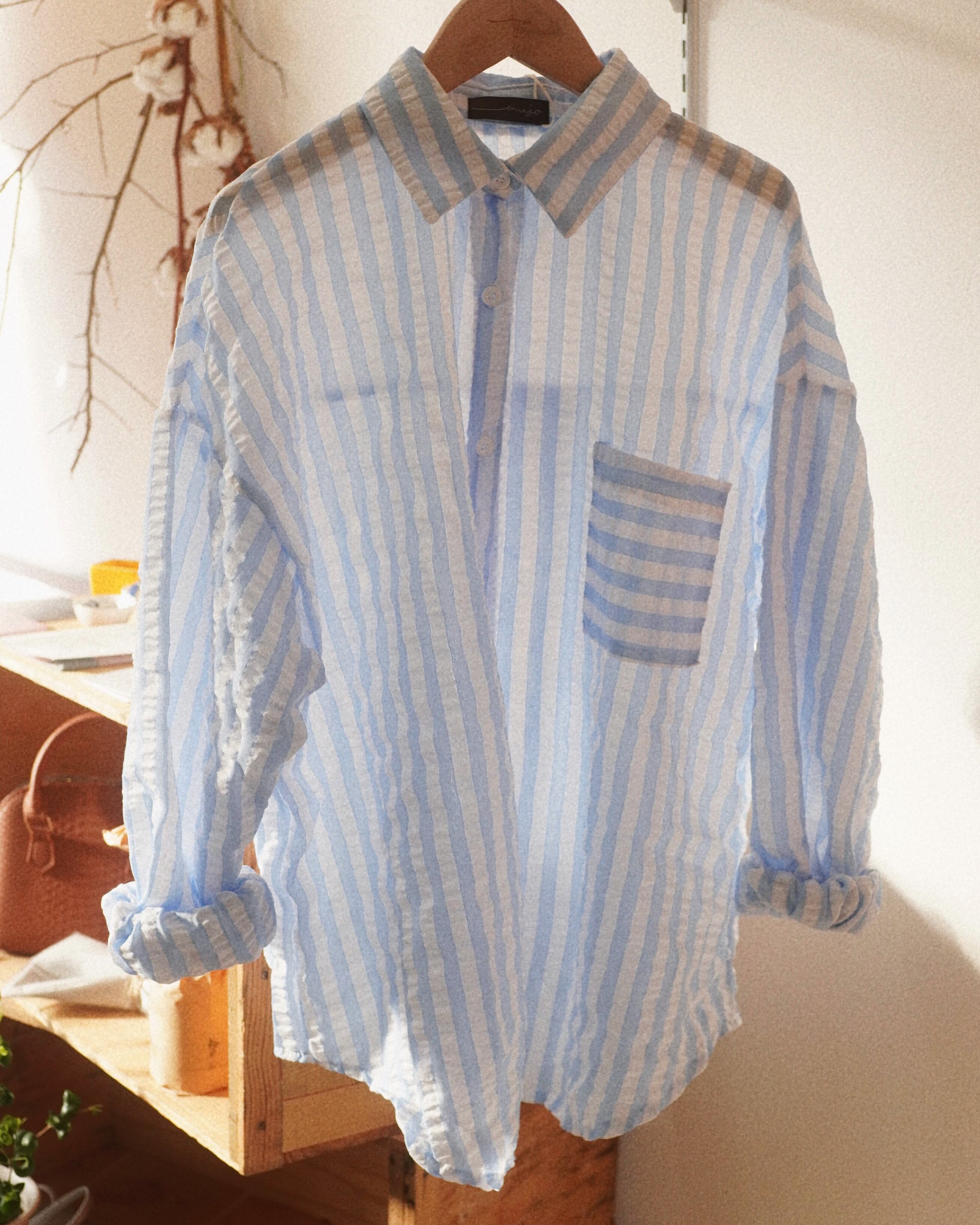 ほんのり透け感のあるシアー素材に、くしゅっとしたシワ加工のウェーブストライプシャツ