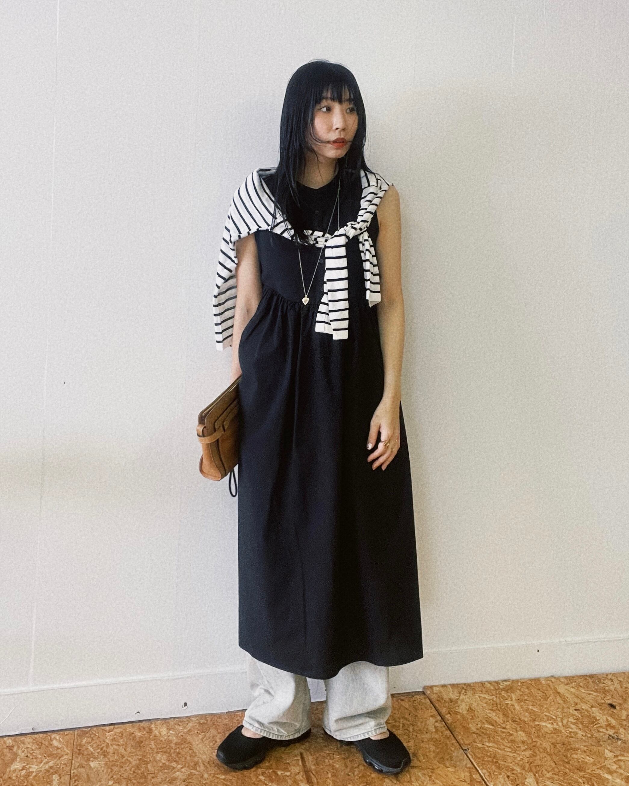 秋口には、カーディガンやパーカー羽織ったり、足元をローファーに変えたりと小物で遊べる一枚です。
