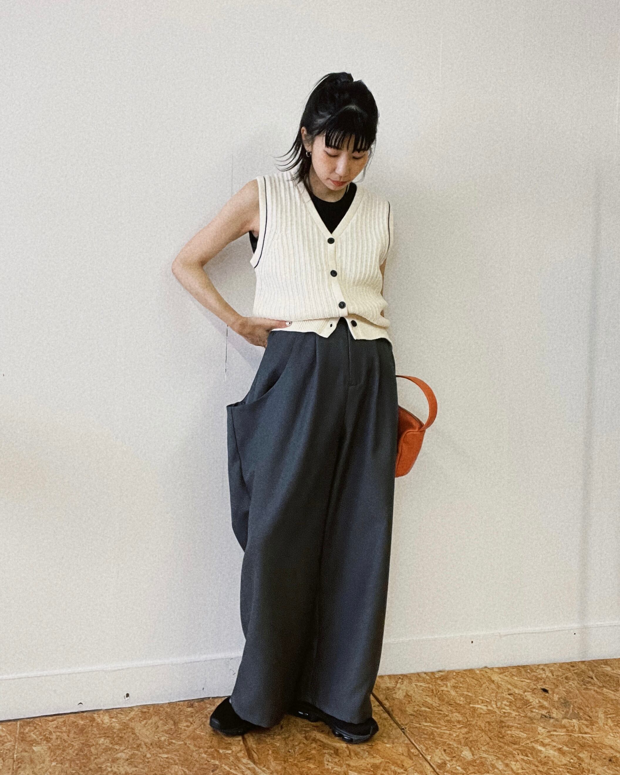 シンプルなトップスと合わせても存在感のある着こなしになる一本です。