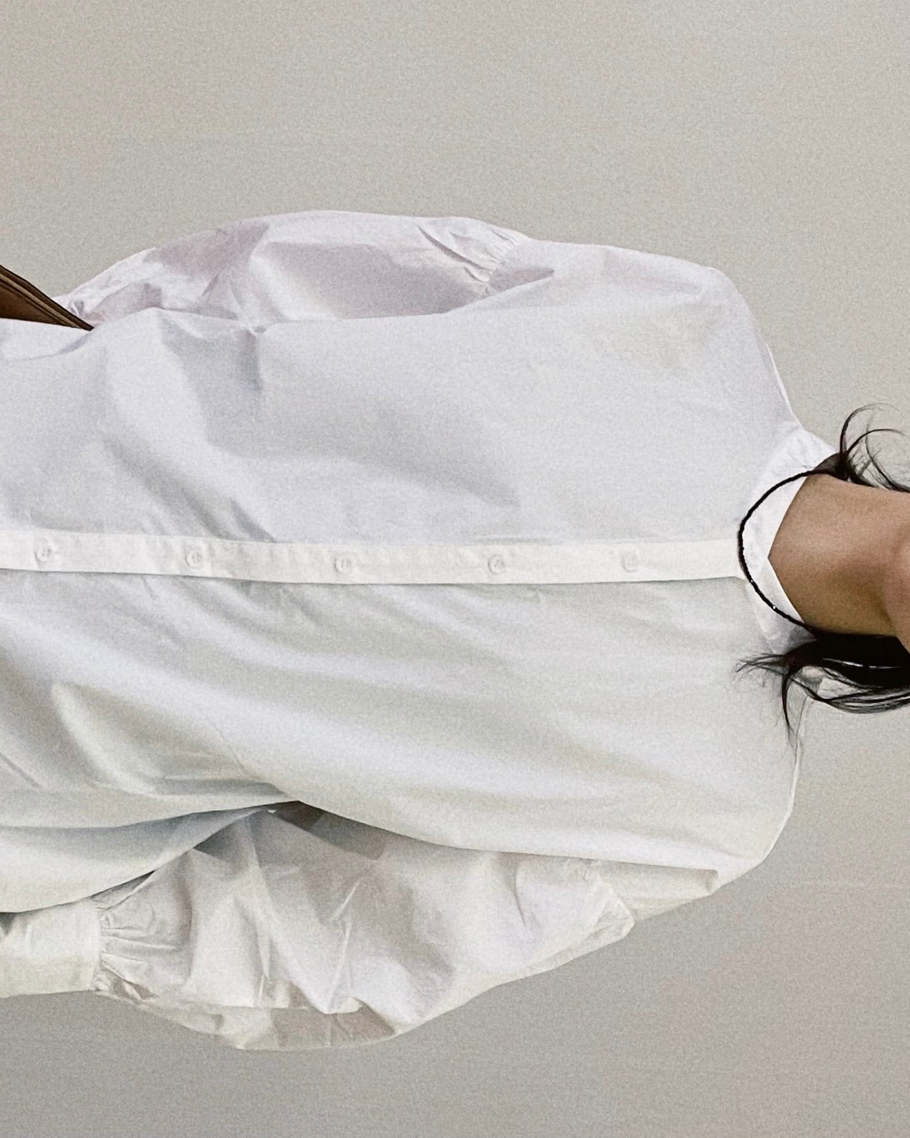 シャープな印象になるバンドカラーシャツも、ふわっとしたアームデザインでやわらかさもプラス。