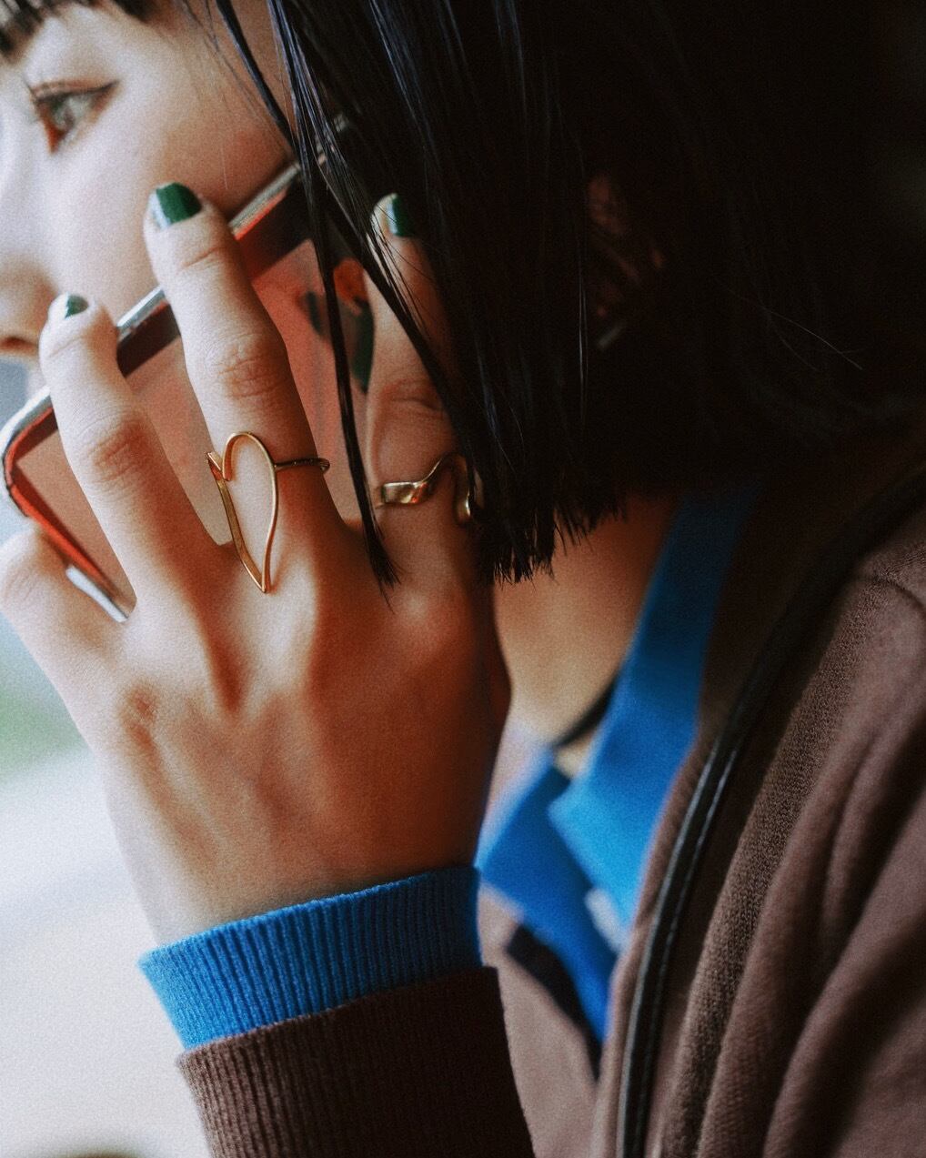 首元や裾、袖口からちらりとのぞく差し色がコーディネートのポイントに。