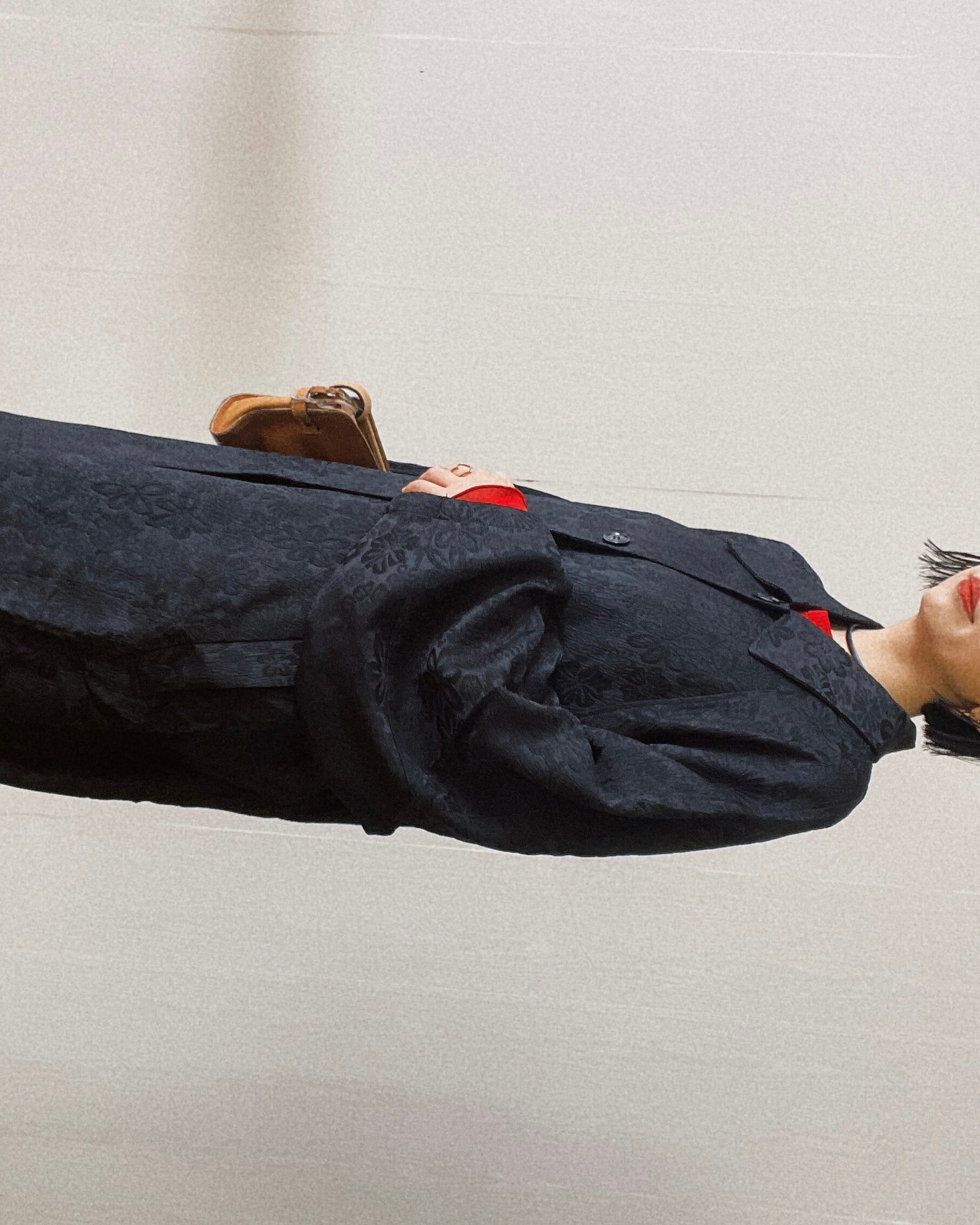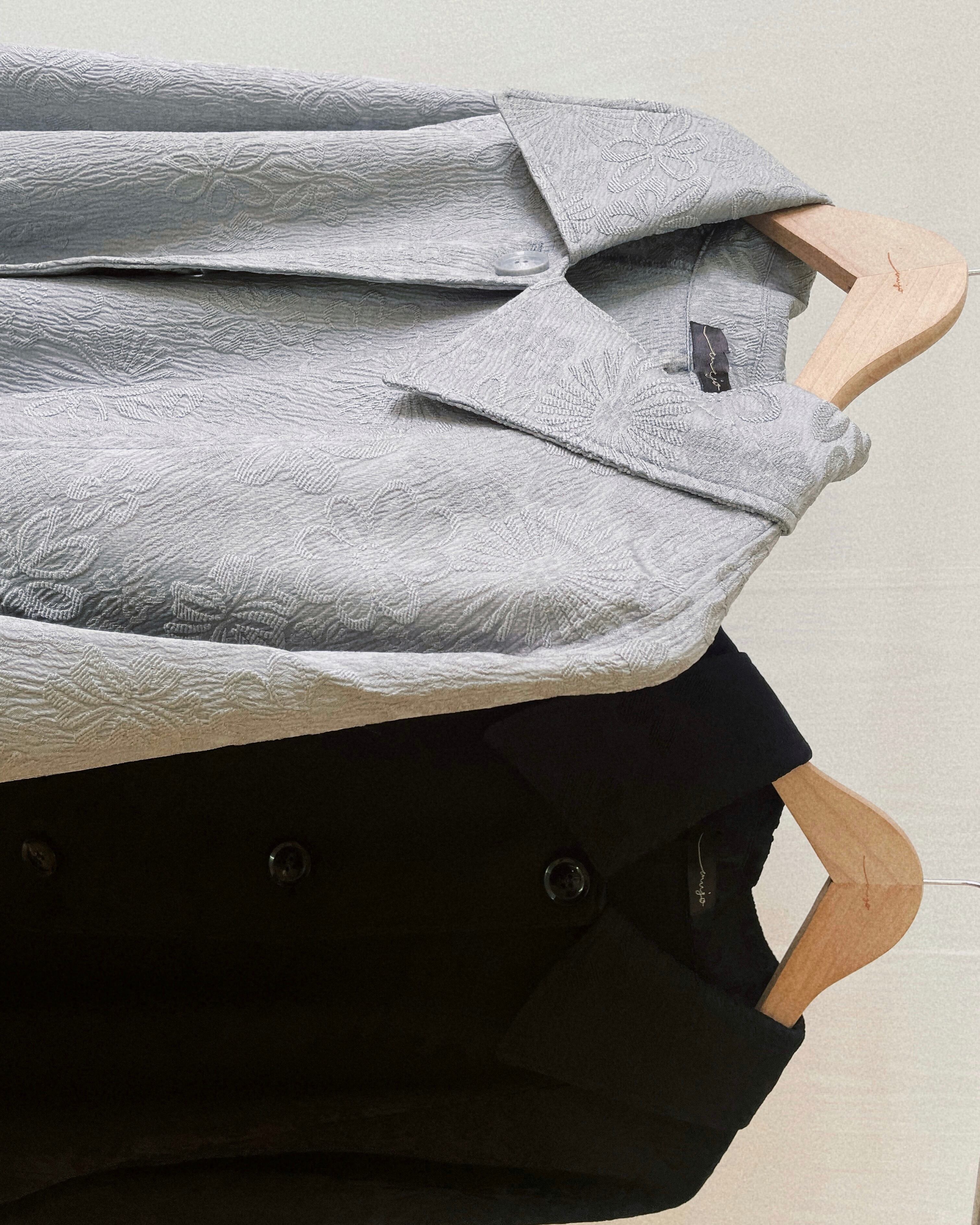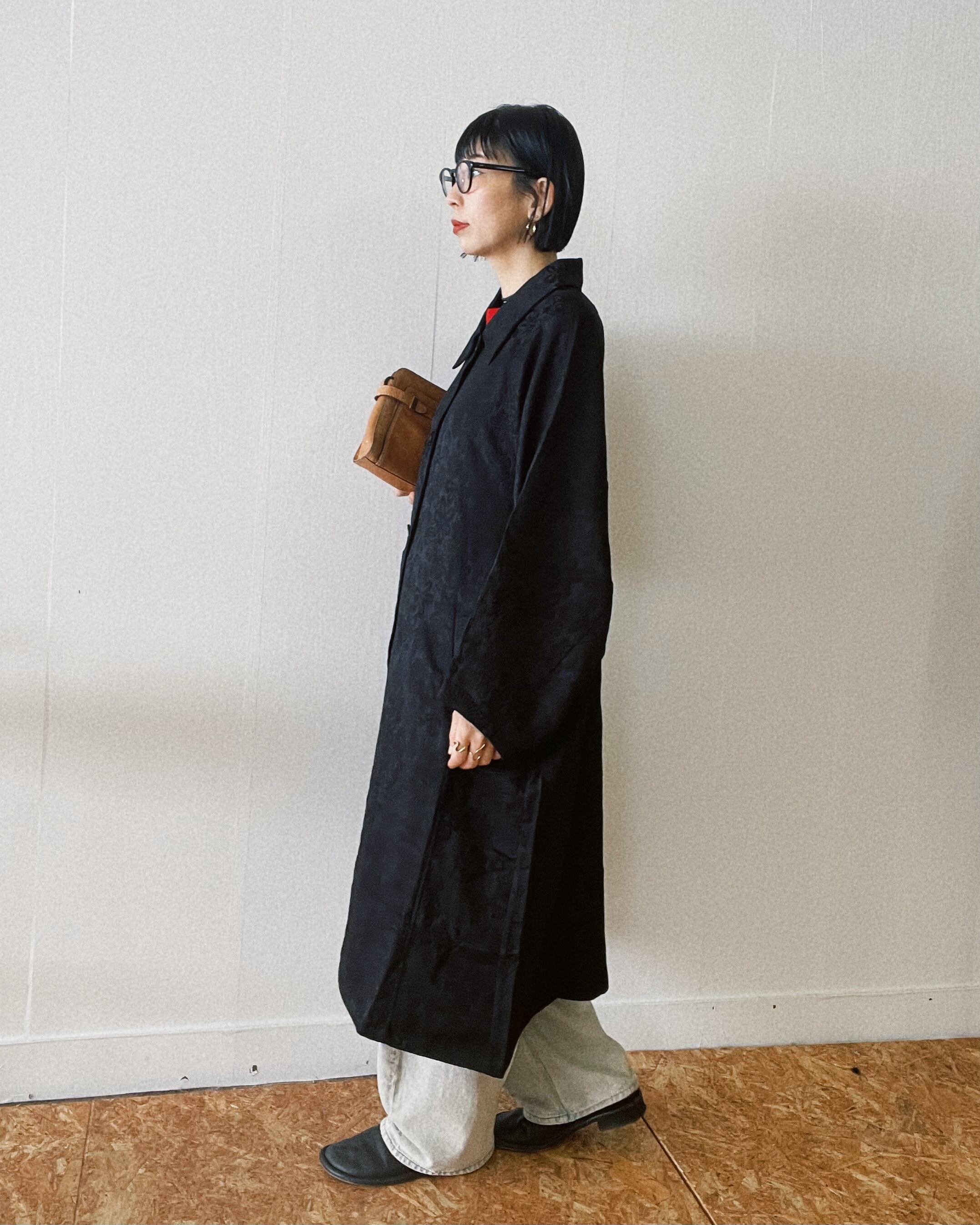 ゆったりとしたシルエットにドロップショルダーを取り入れ、和服のようなシルエットに。