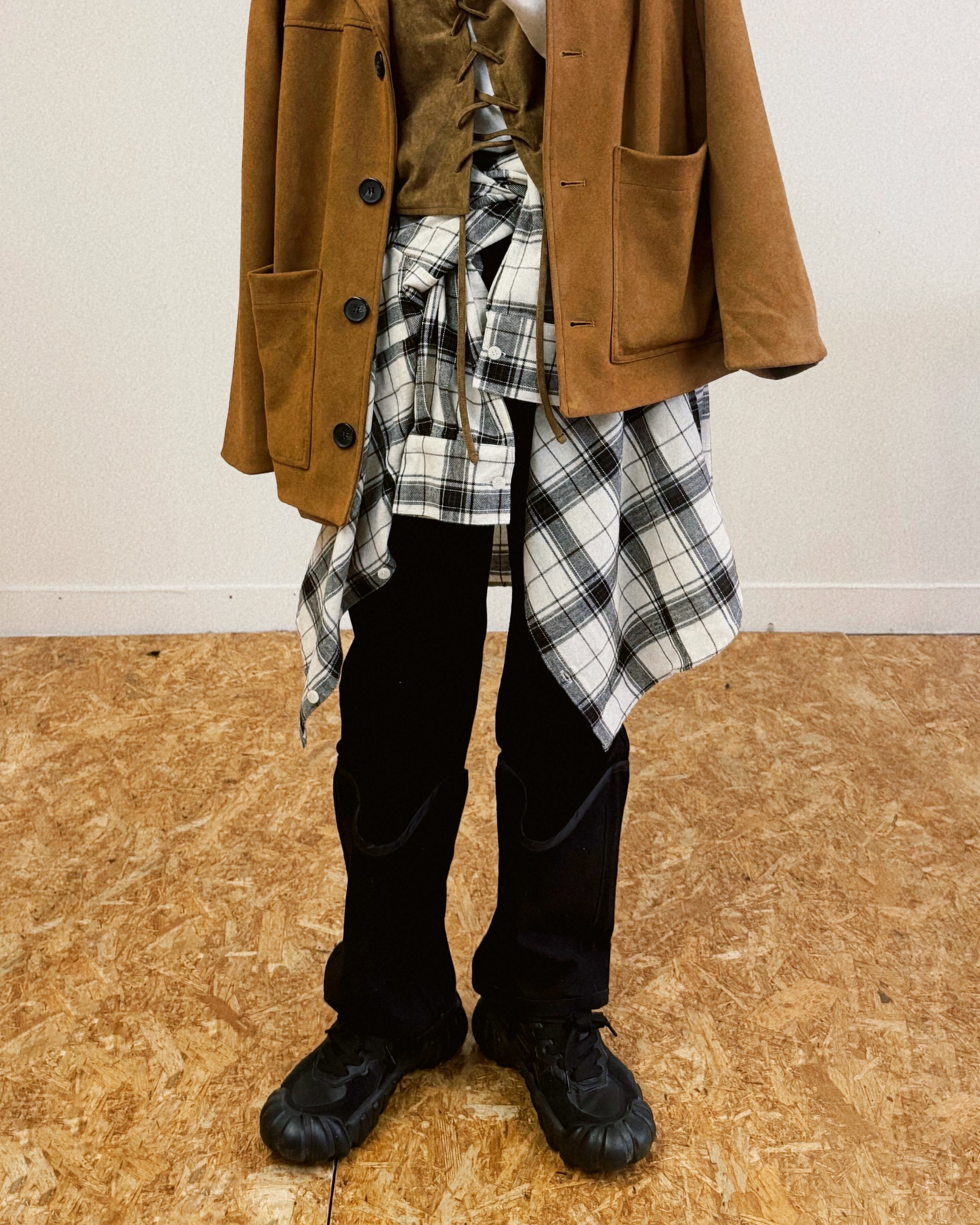 腰まわりはきれいにフィットし、ストンと落ちるストレートラインに、レッグカバーを重ねたような足元のデザインがポイント。