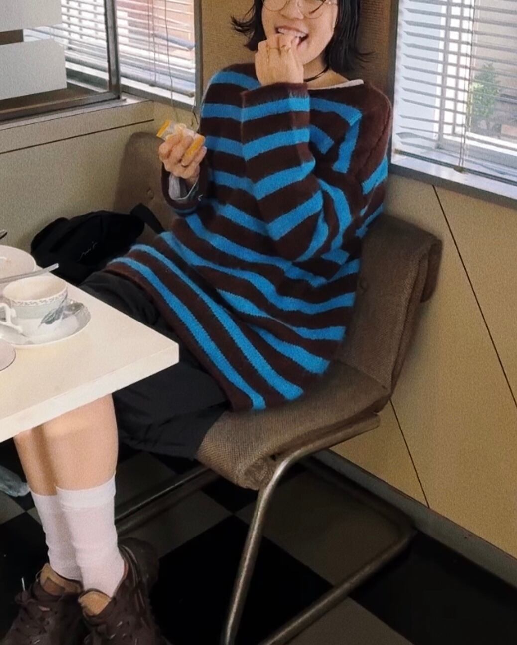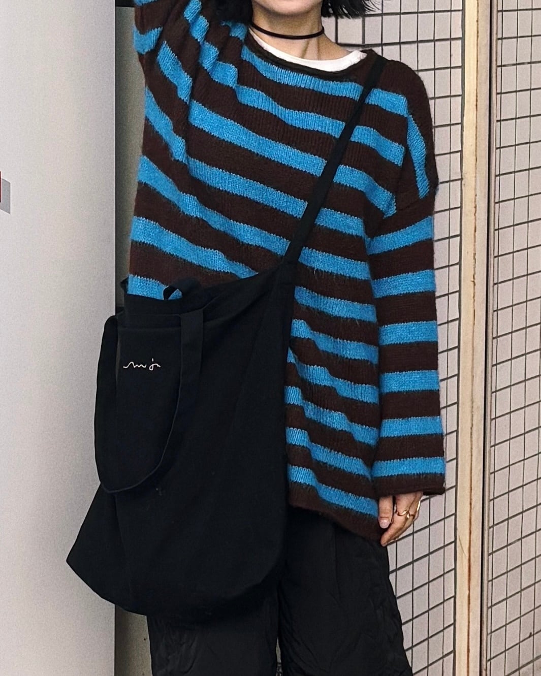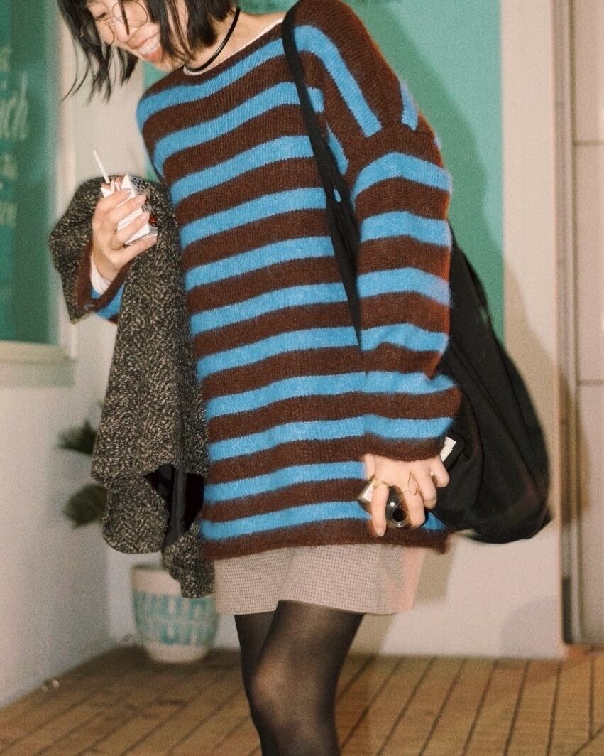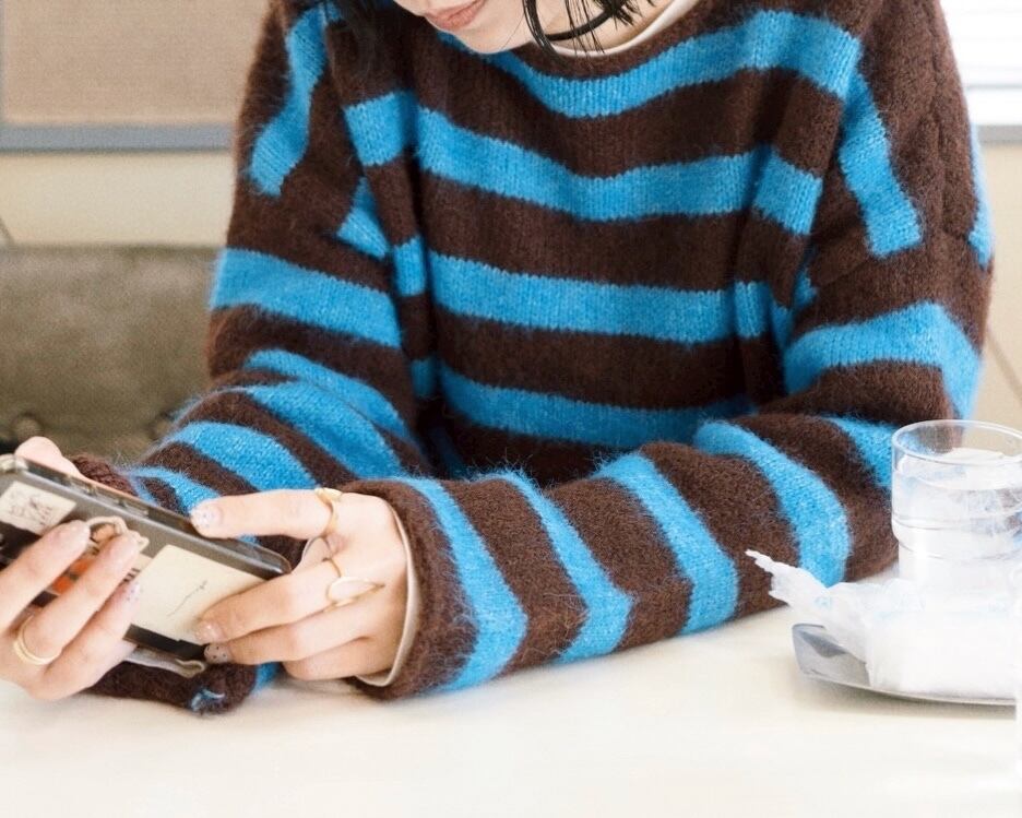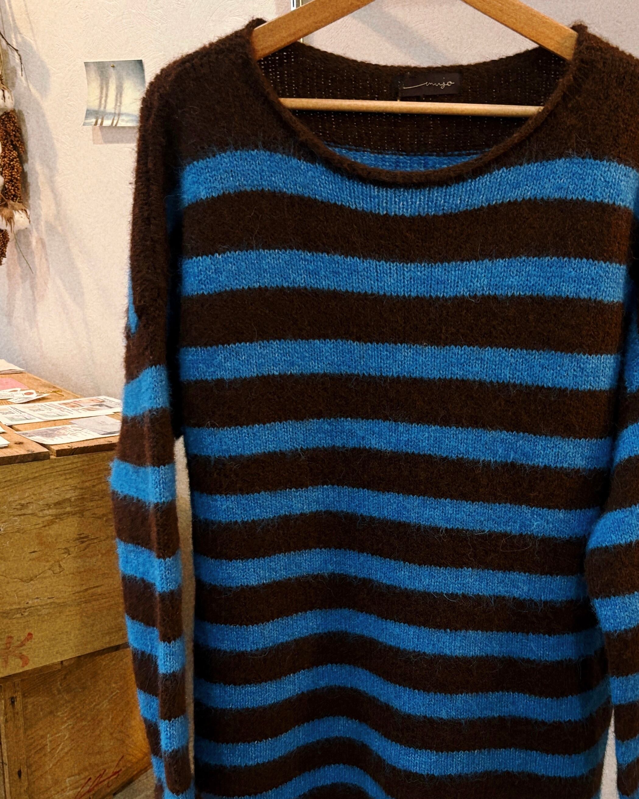 ブラウン×ブルーの配色が存在感のあるボーダーニットプルオーバー