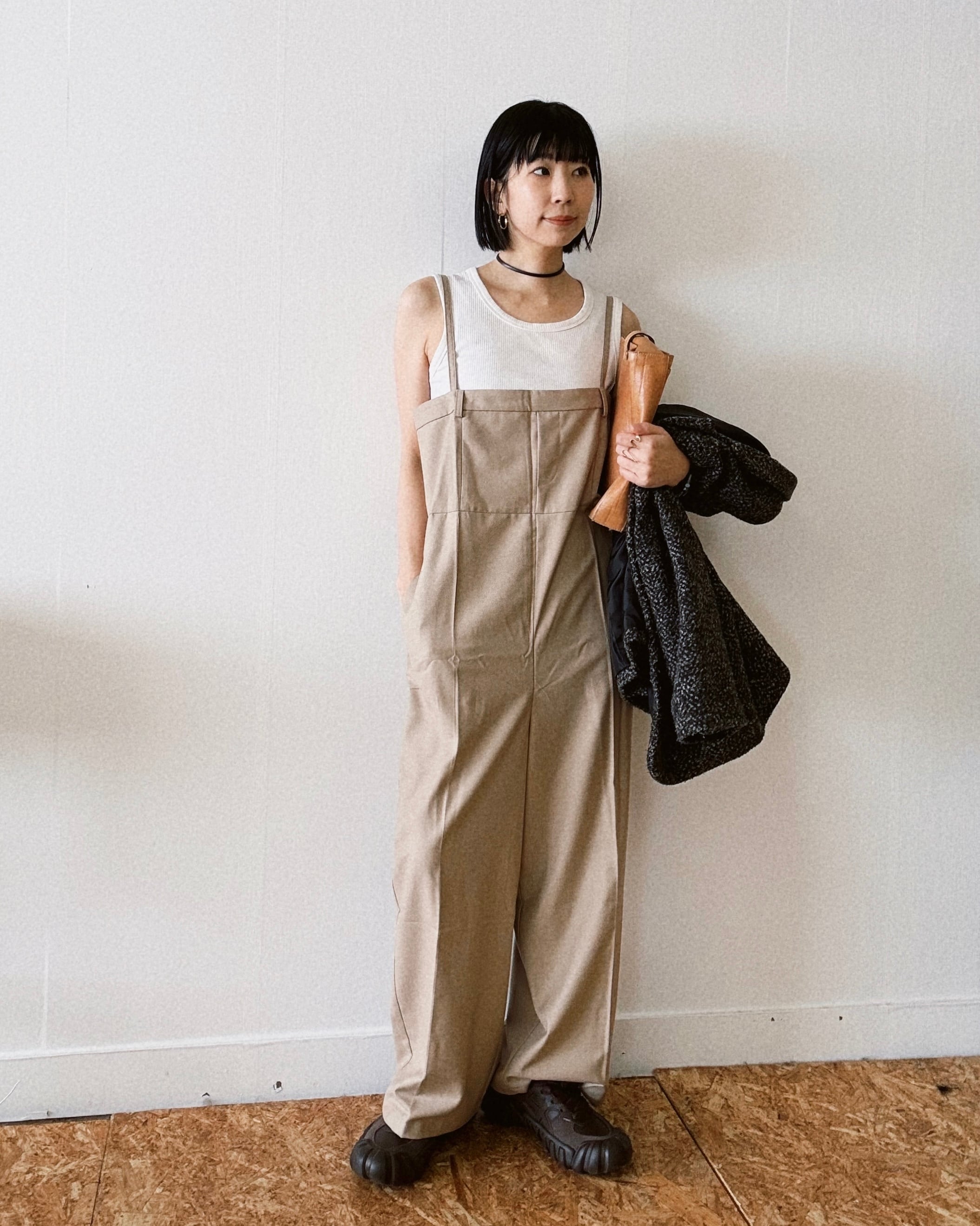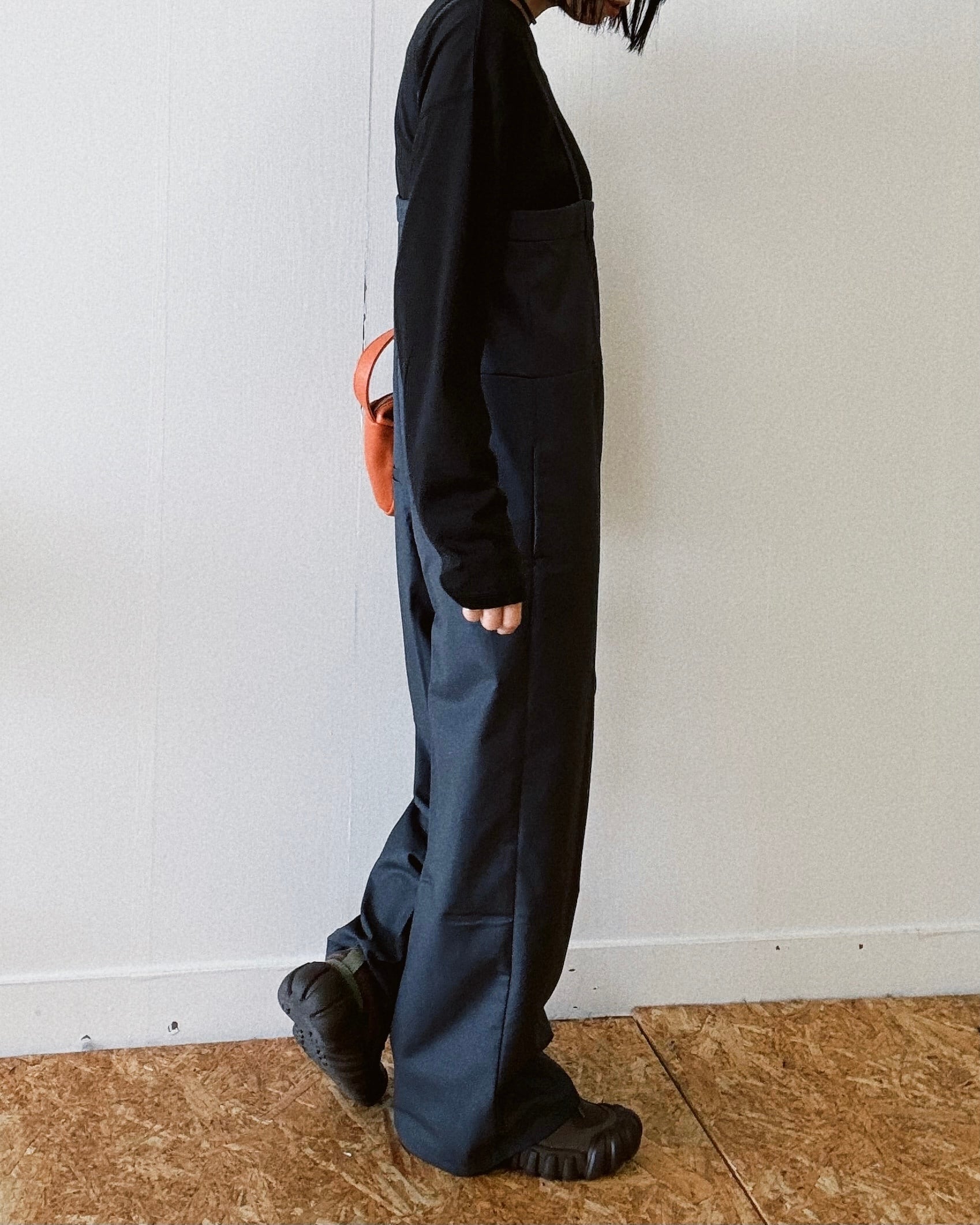ジャンプスーツのカジュアルさに、スラックスのディティールと素材感を取り入れたオールインワン
