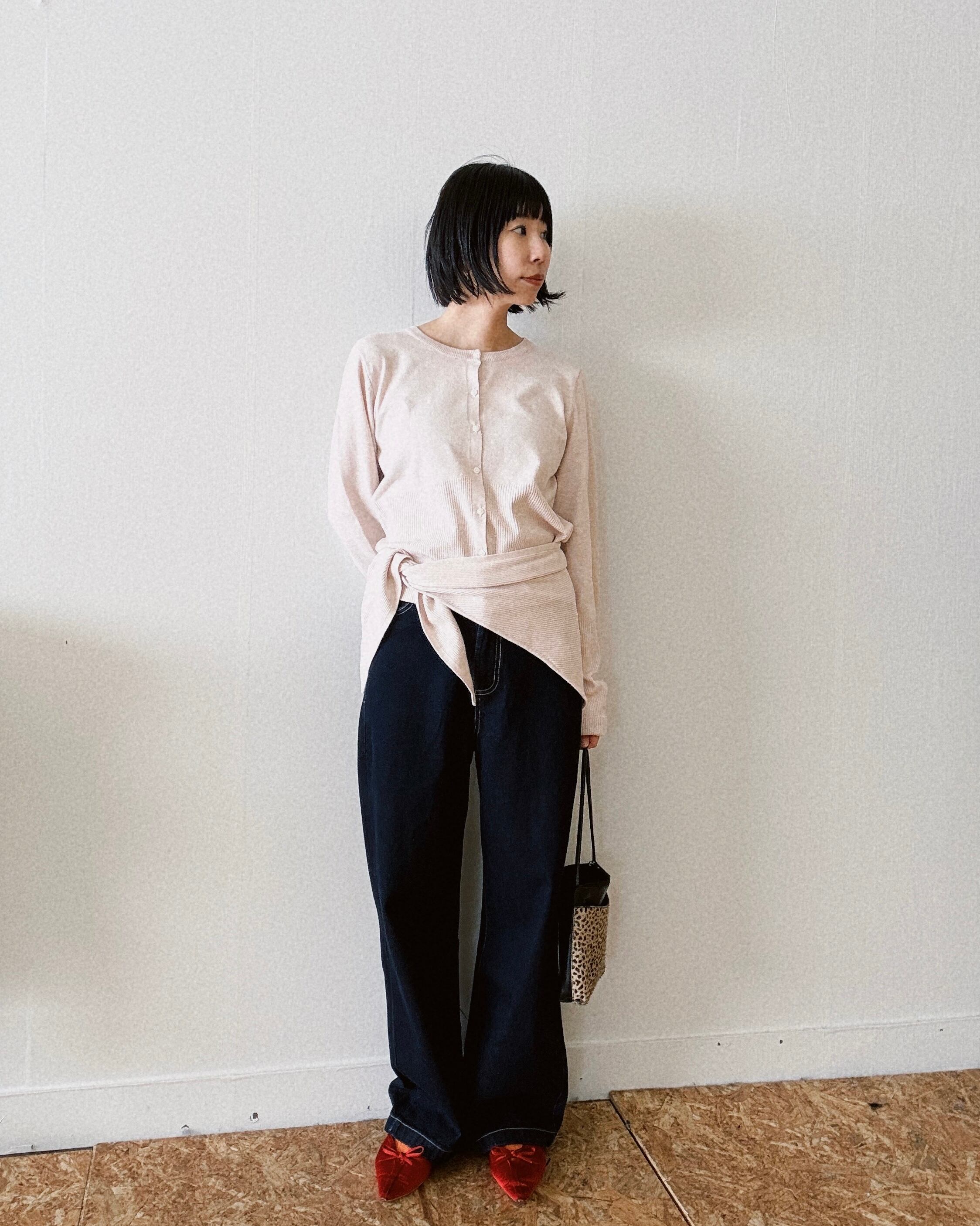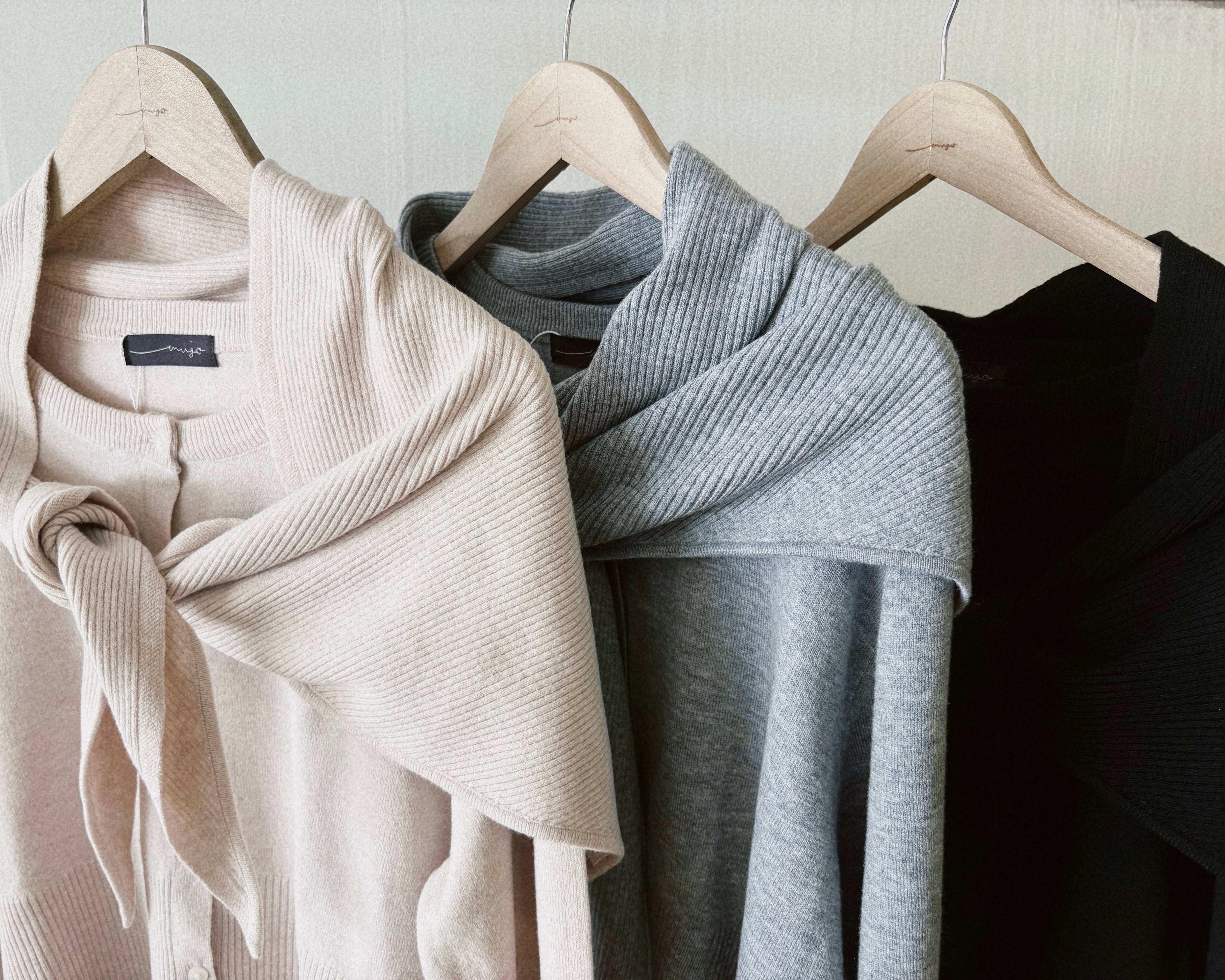 カーディガンは前を閉じてプルオーバー風に着用可能。ストールは、お手持ちのジャケットやトップスにあわせても○