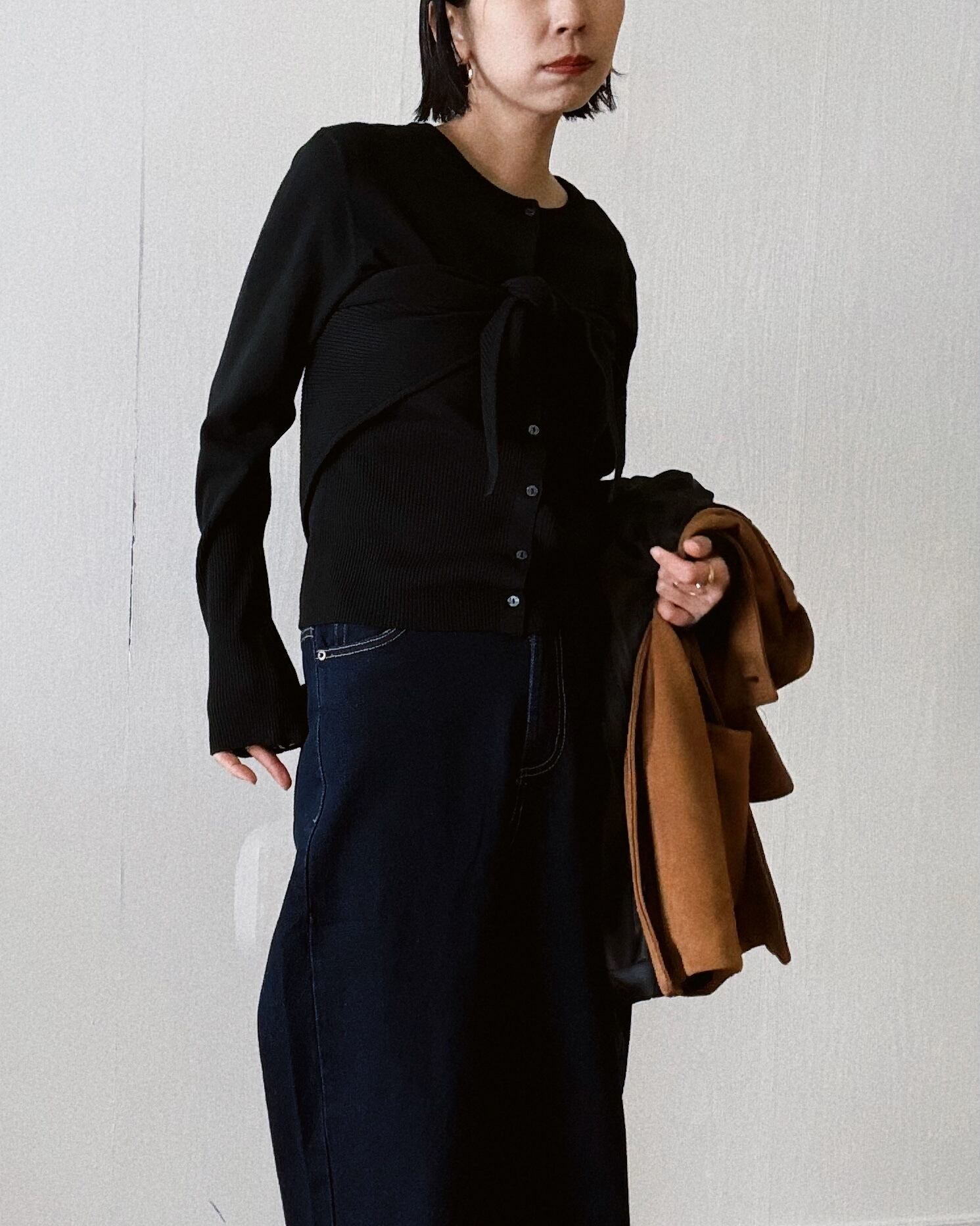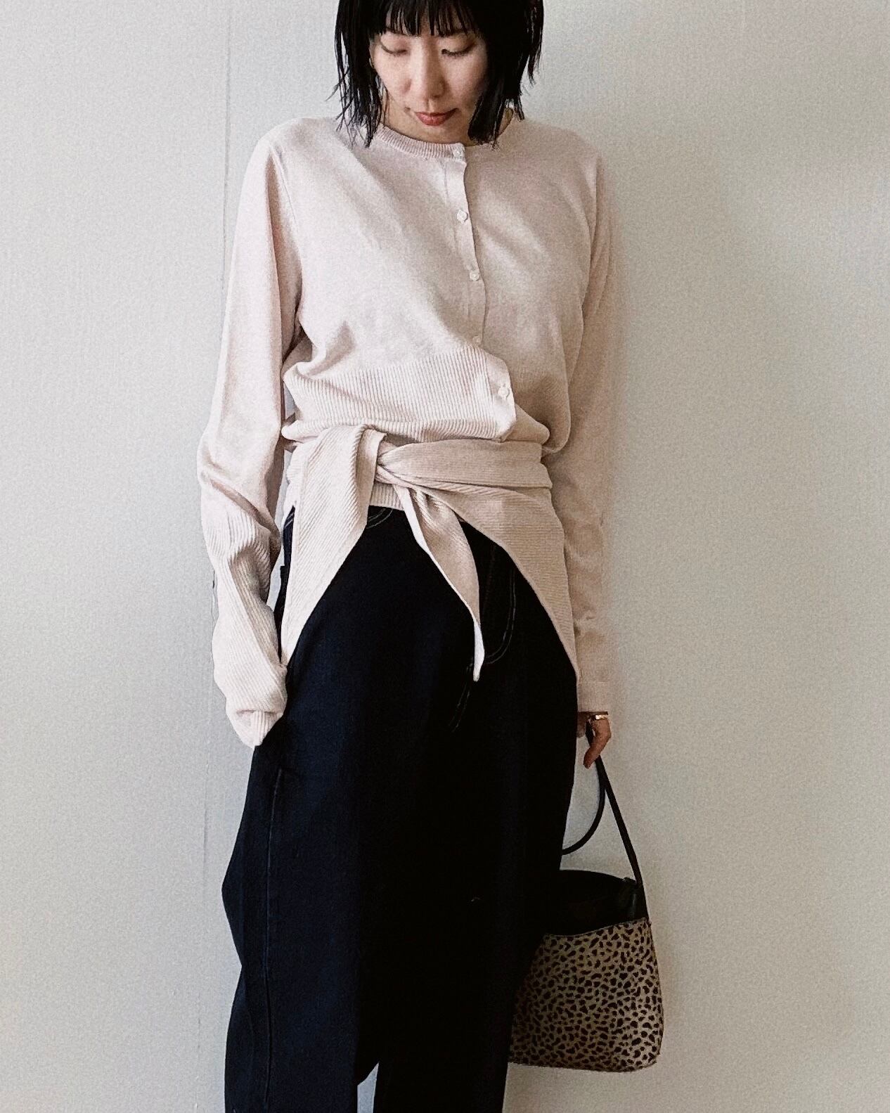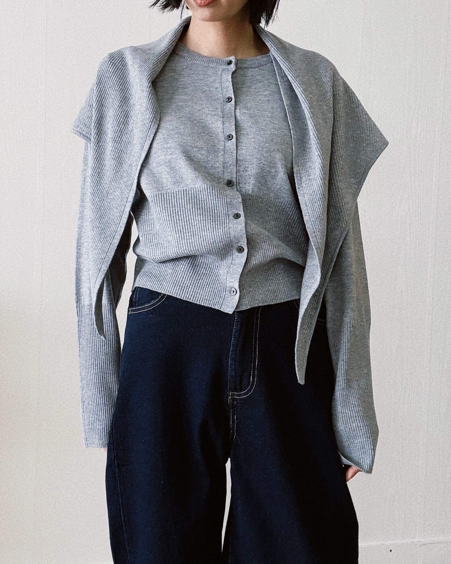 クルーネックの上品なカーディガンに、ストールを無造作に巻くだけで旬なレイヤードスタイルに。