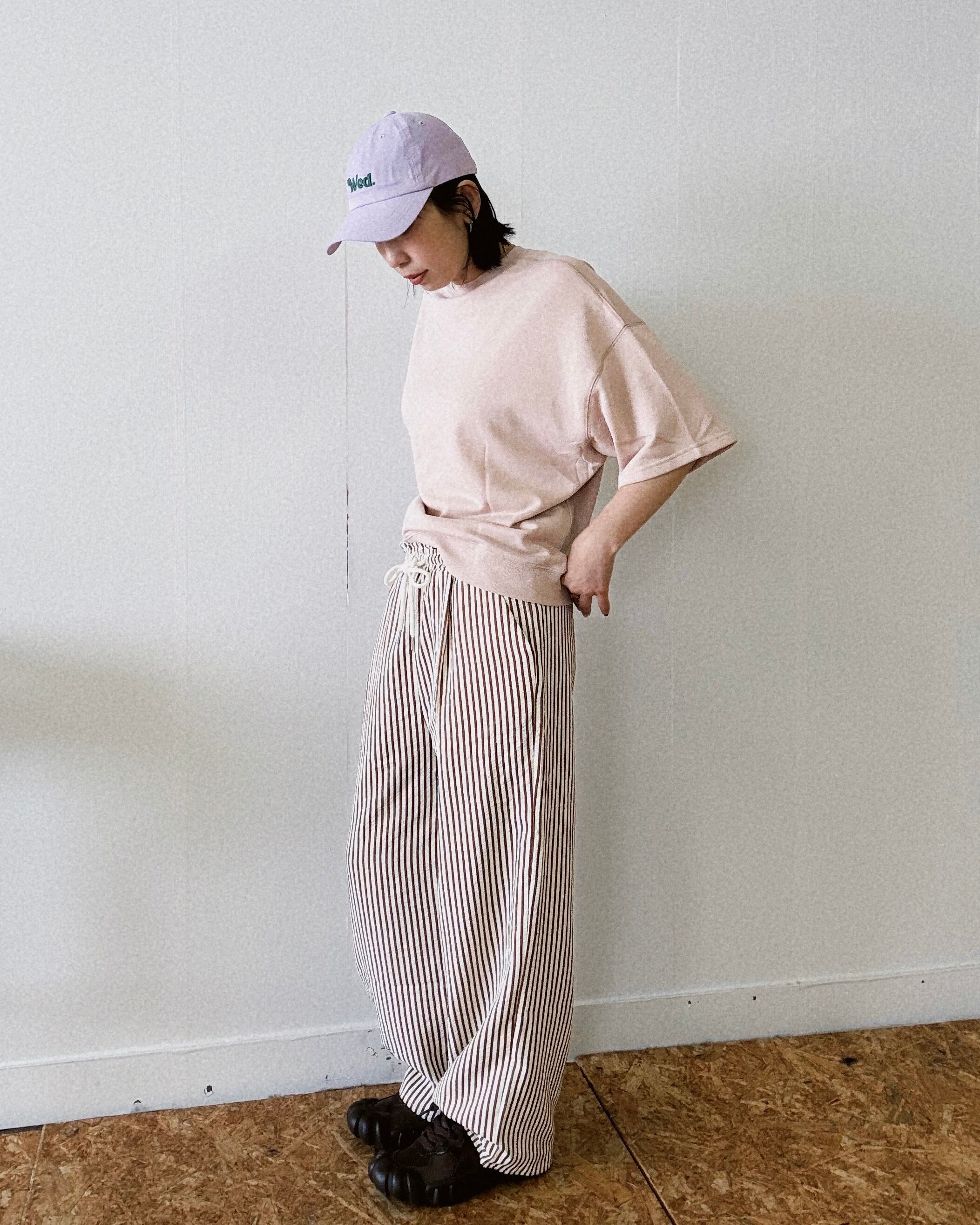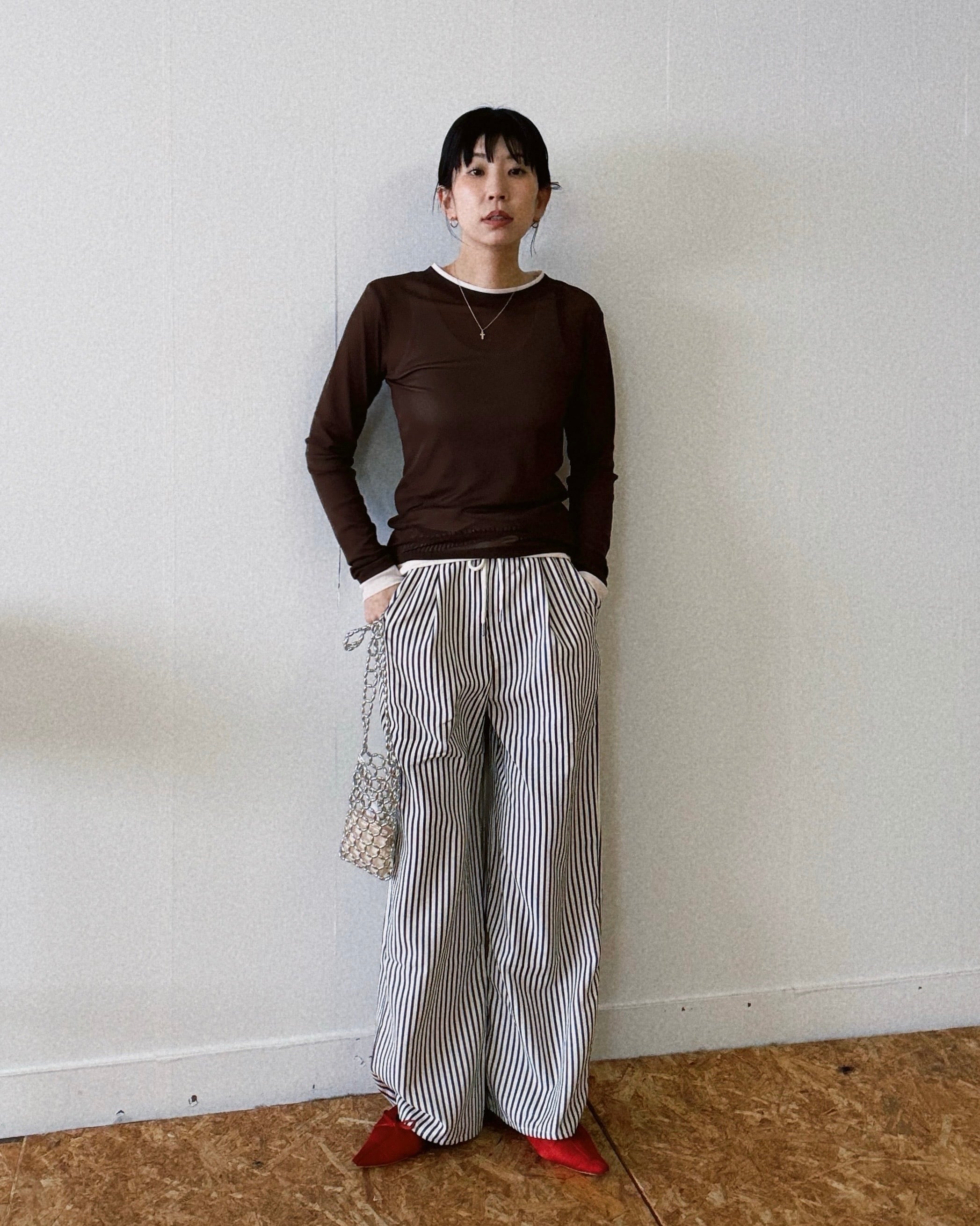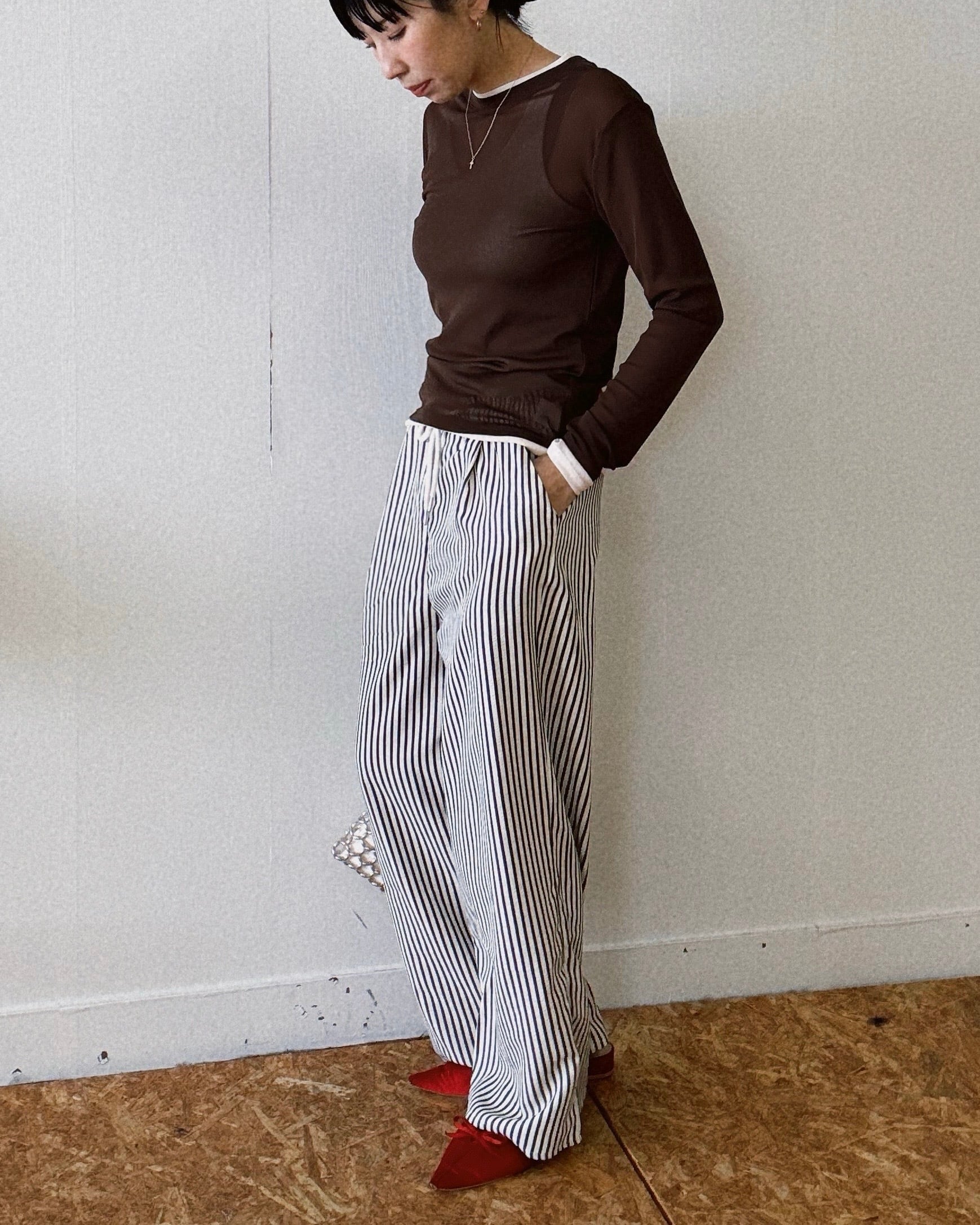 縦のストライプがすっきりと見せてくれるので、ラフなのにどこか上品な雰囲気に。