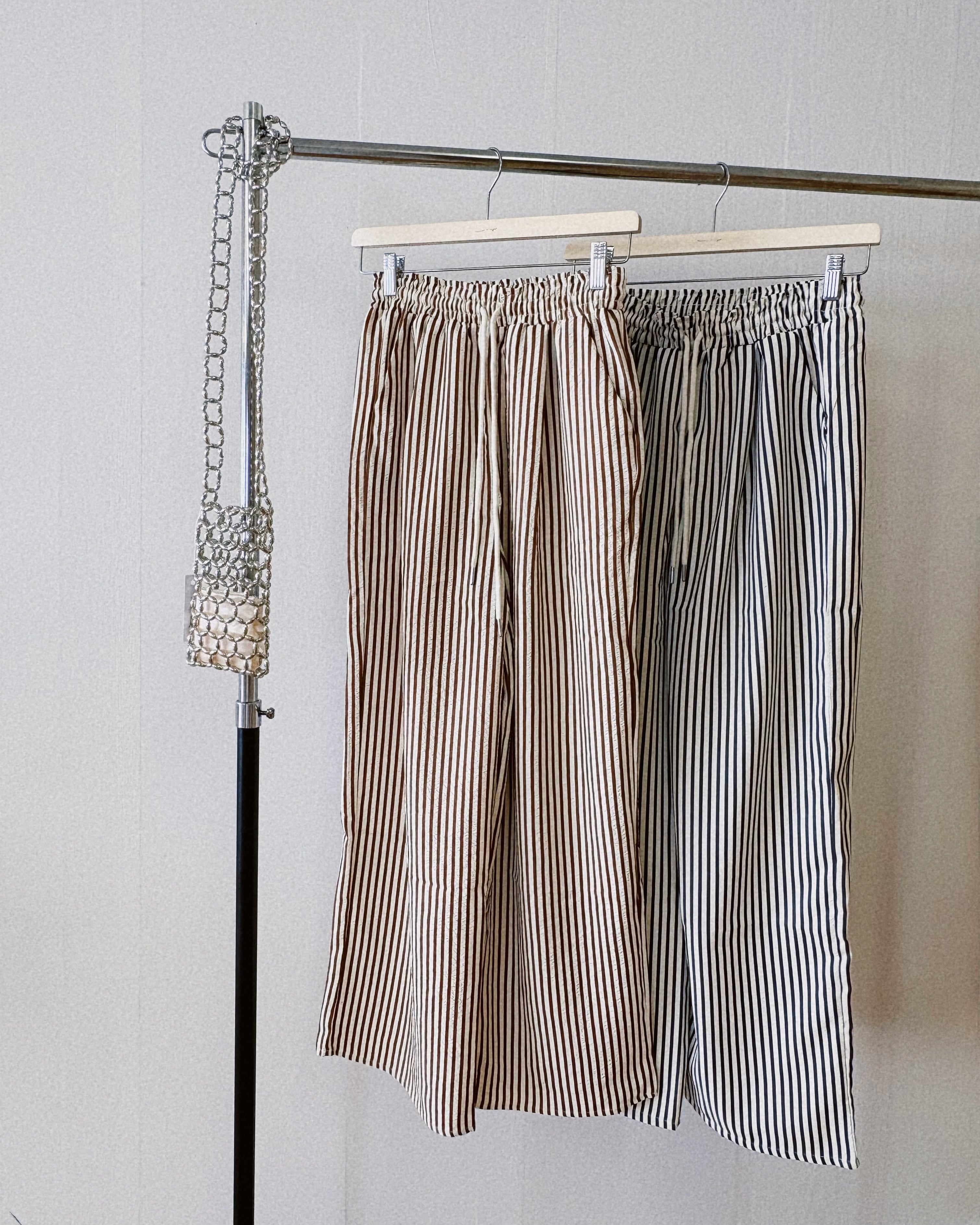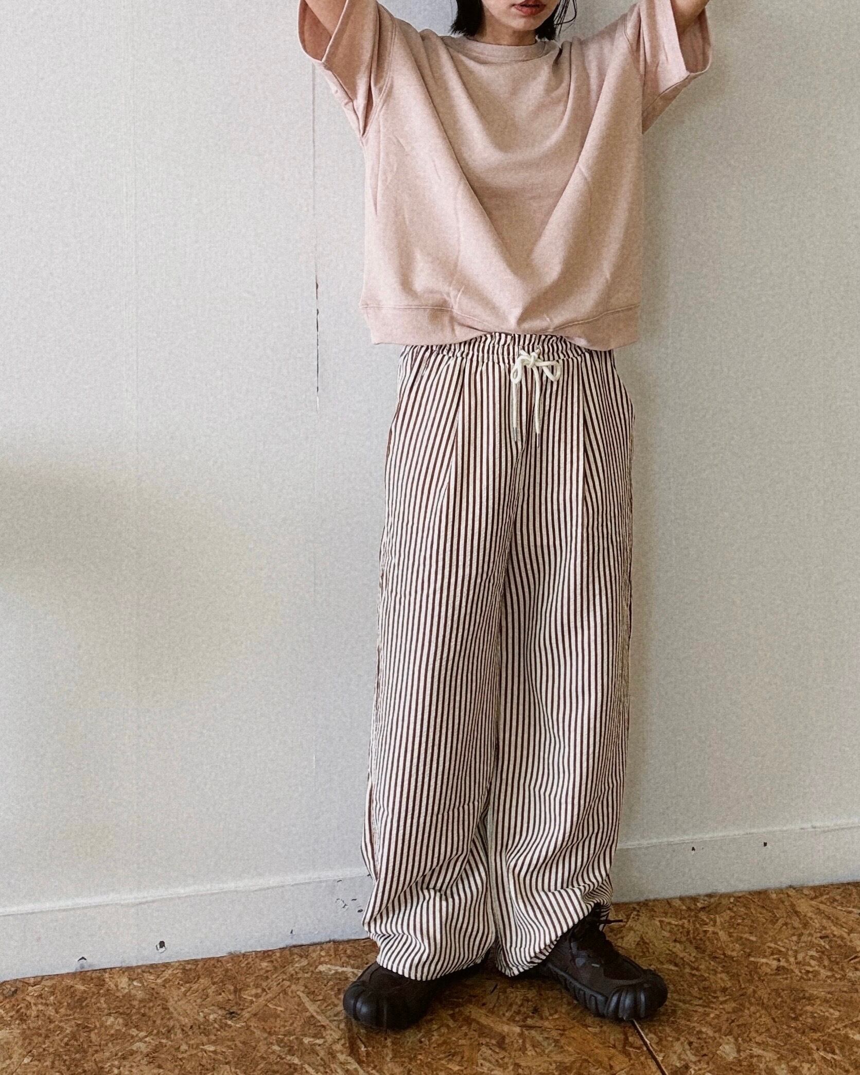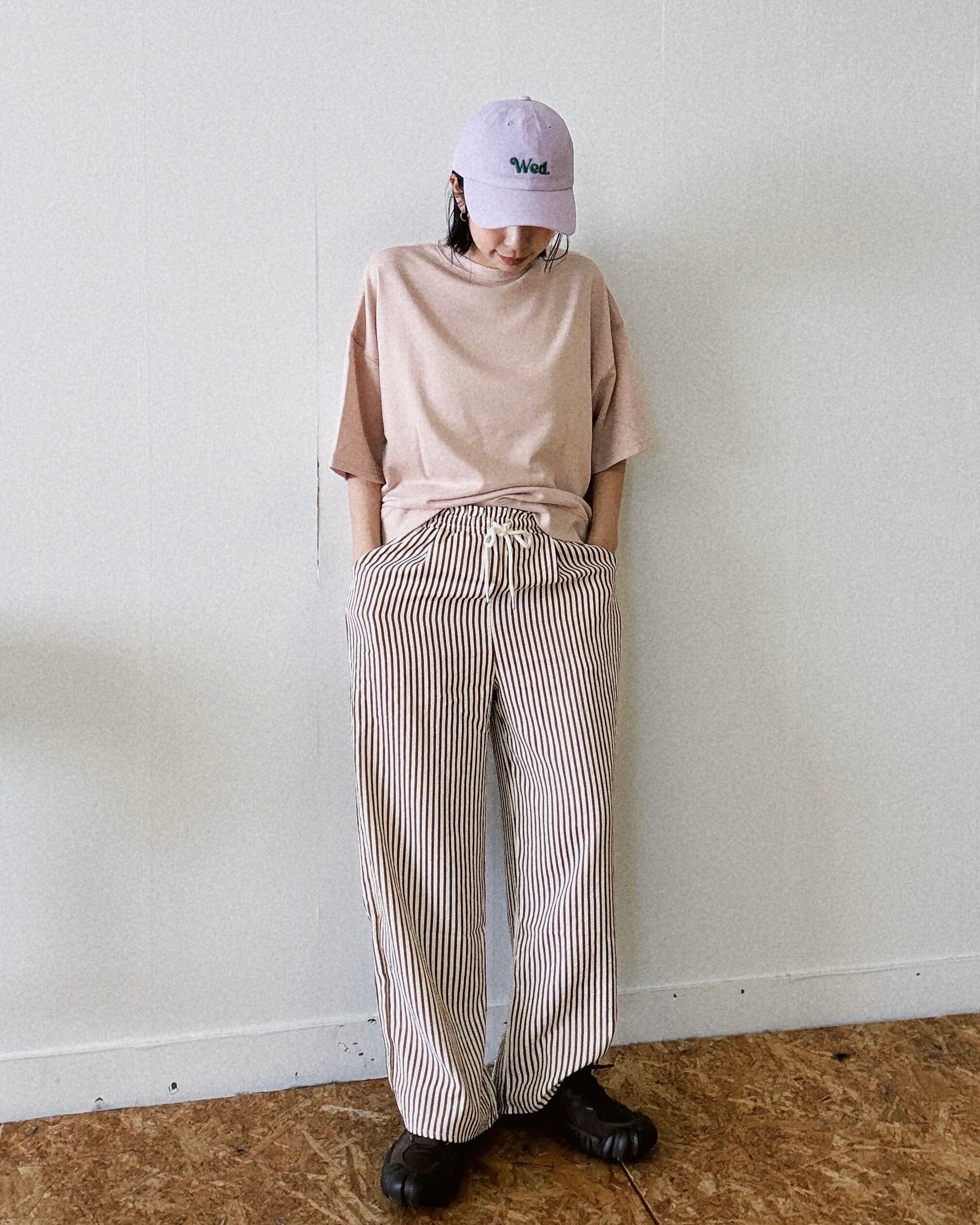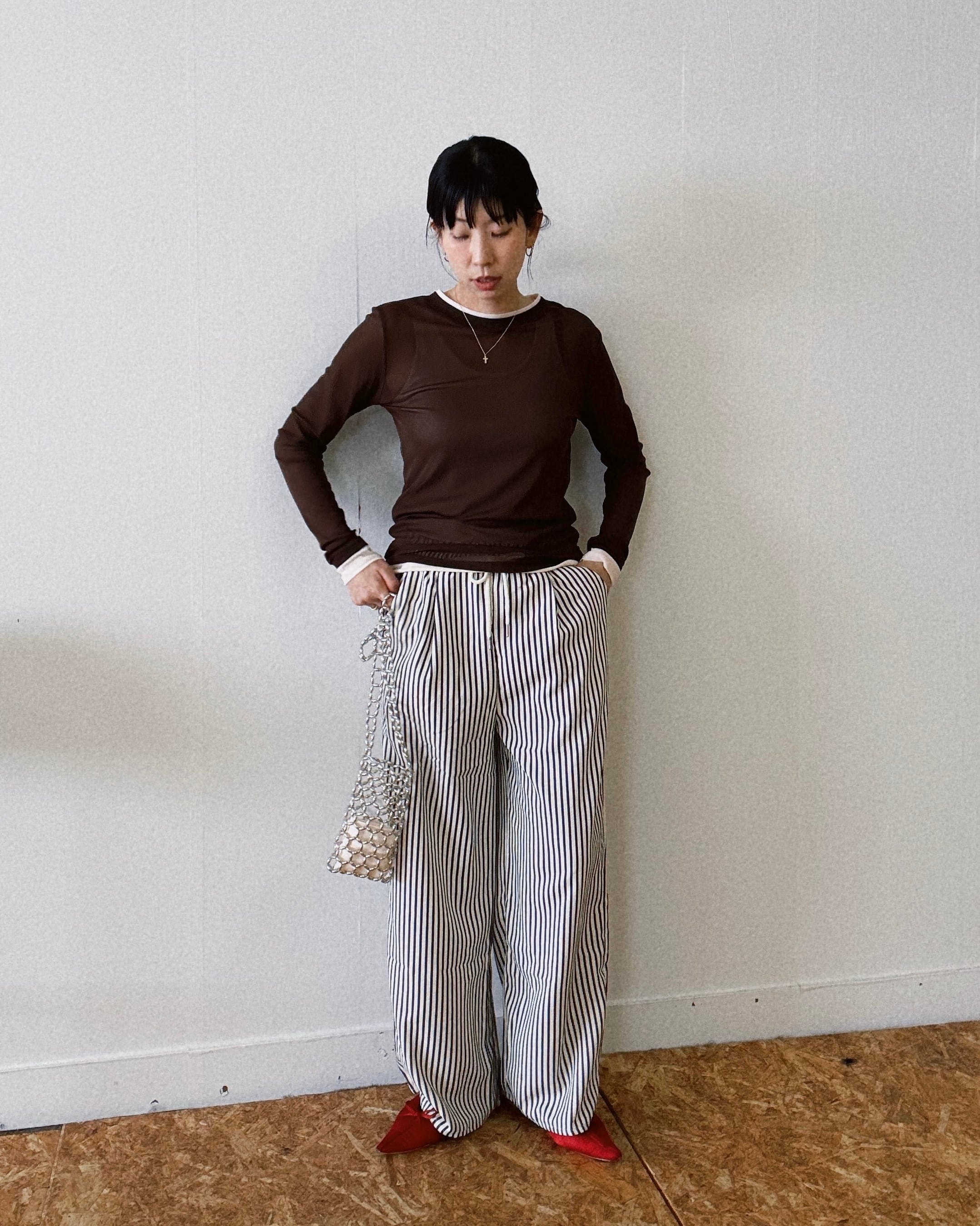 縦のストライプがすっきりと見せてくれるので、ラフなのにどこか上品な雰囲気に。