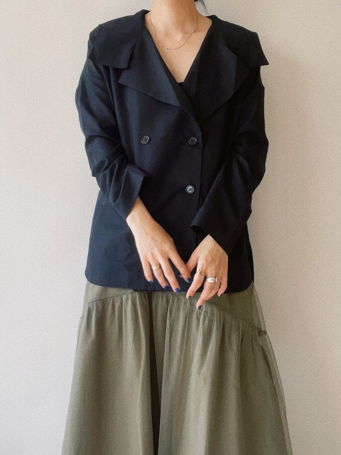 トレンドの存在感ある大きめのセーラーカラーが印象的な大人ジャケット。