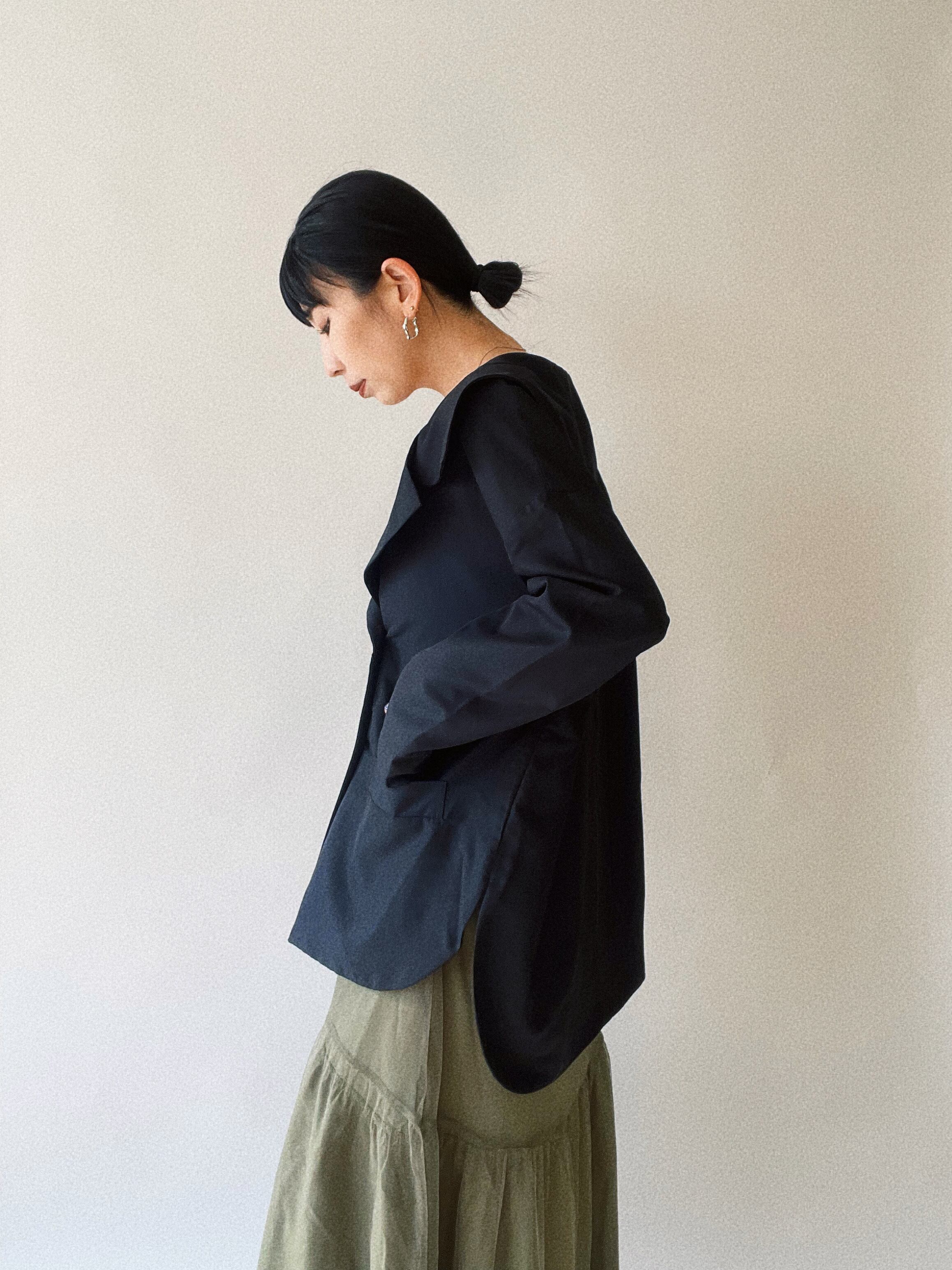 裾のラウンド、セーラーカラーデザインがシャープさを程よく引き算してくれています。