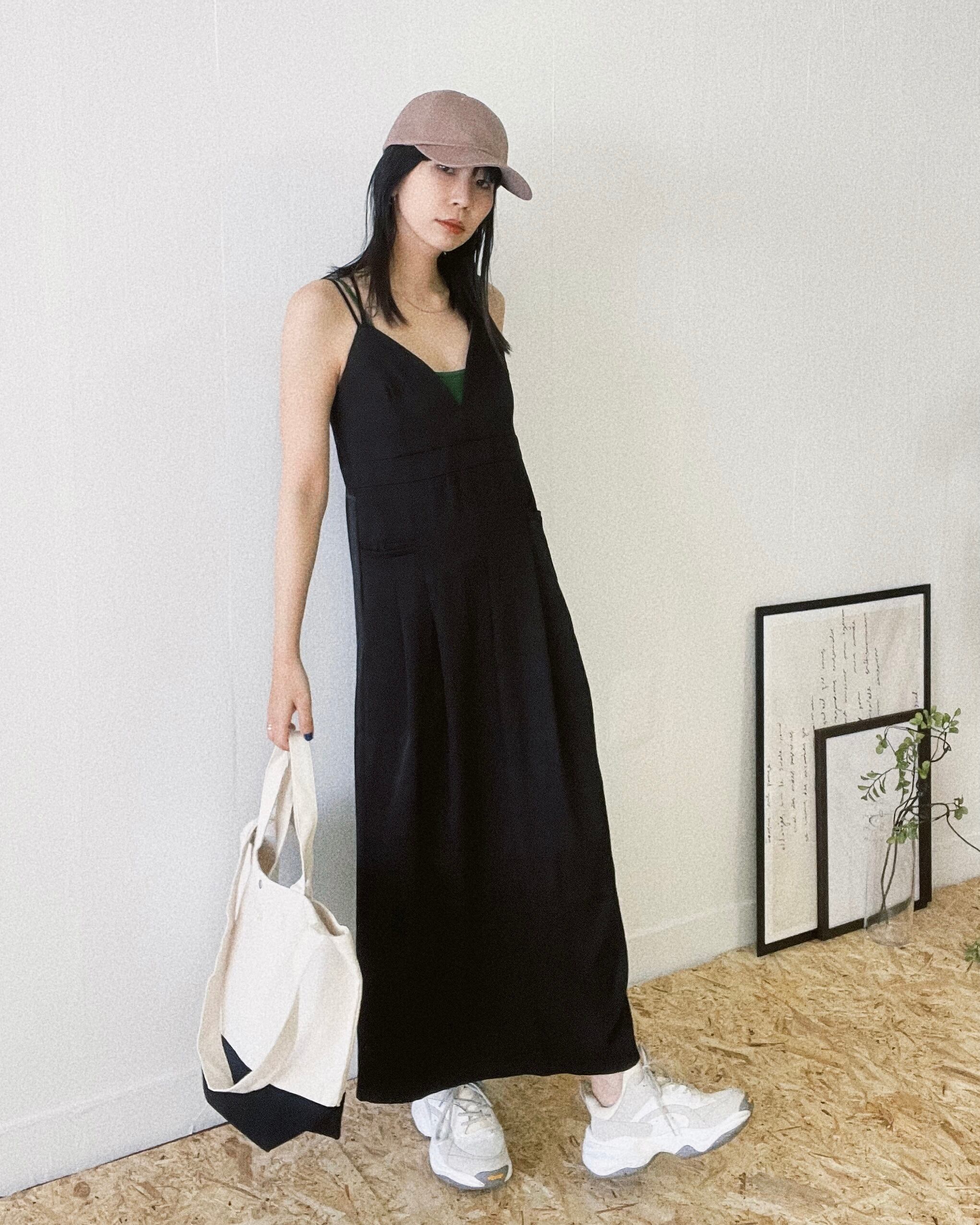 高めのウエスト切替はスタイルアップ効果があり、肩ストラップはアジャスター付きで身長問わずお好みの丈感に調整が可能。