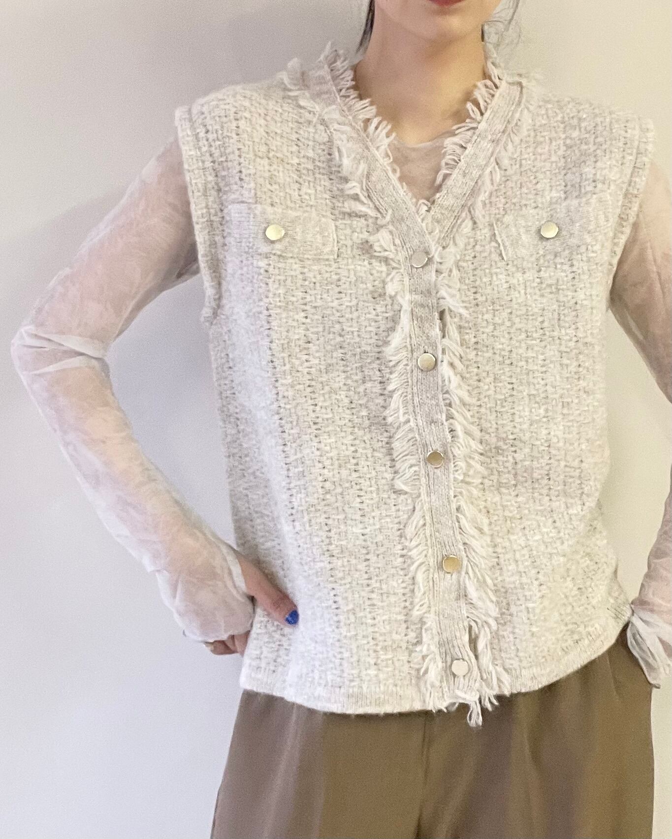 ダブルポケットデザインに、贅沢なフリンジ使いとふわふわのツイード生地が可愛いジレベストです。