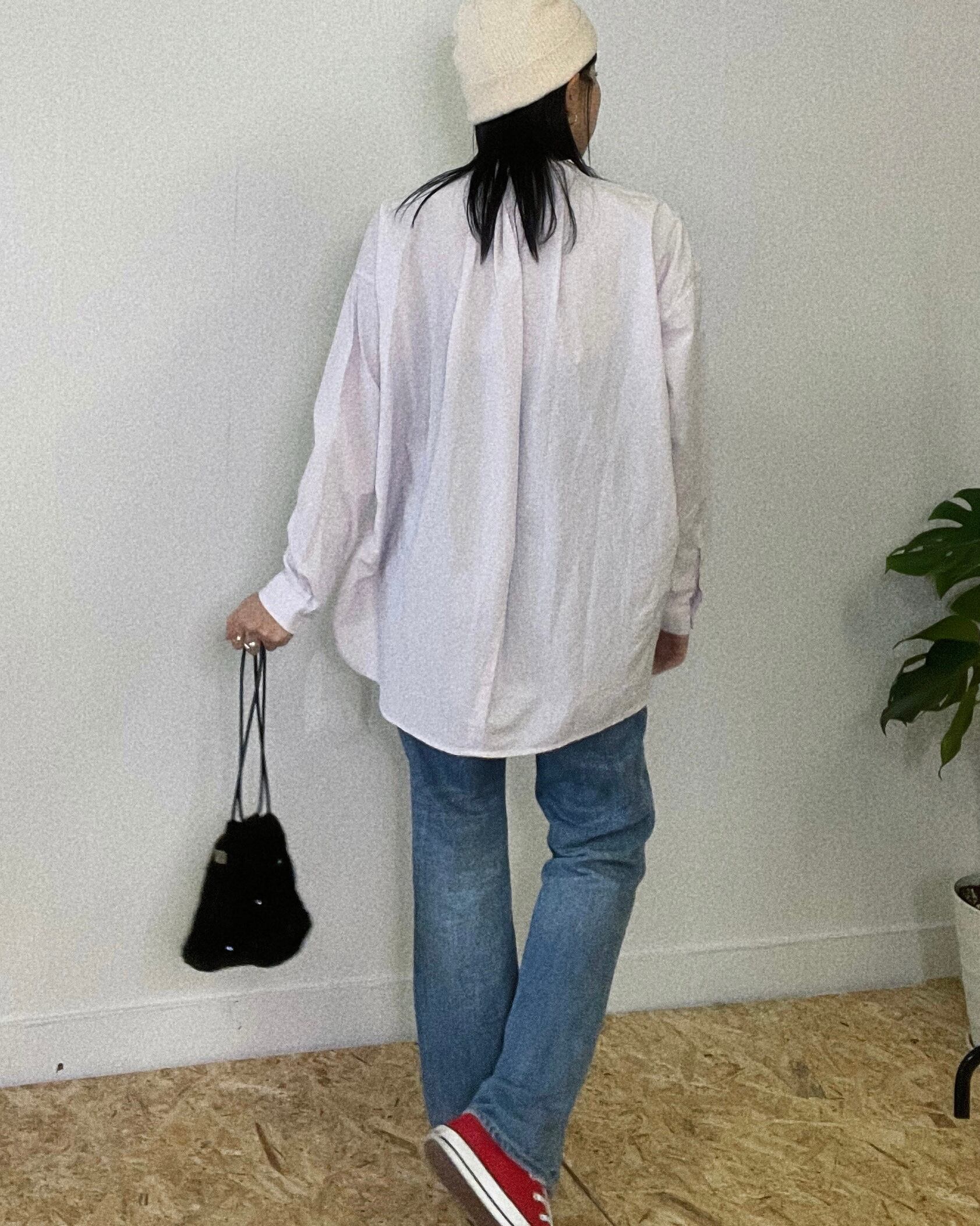 ゆるっと着れるオーバーサイズのバンドカラーシャツ。