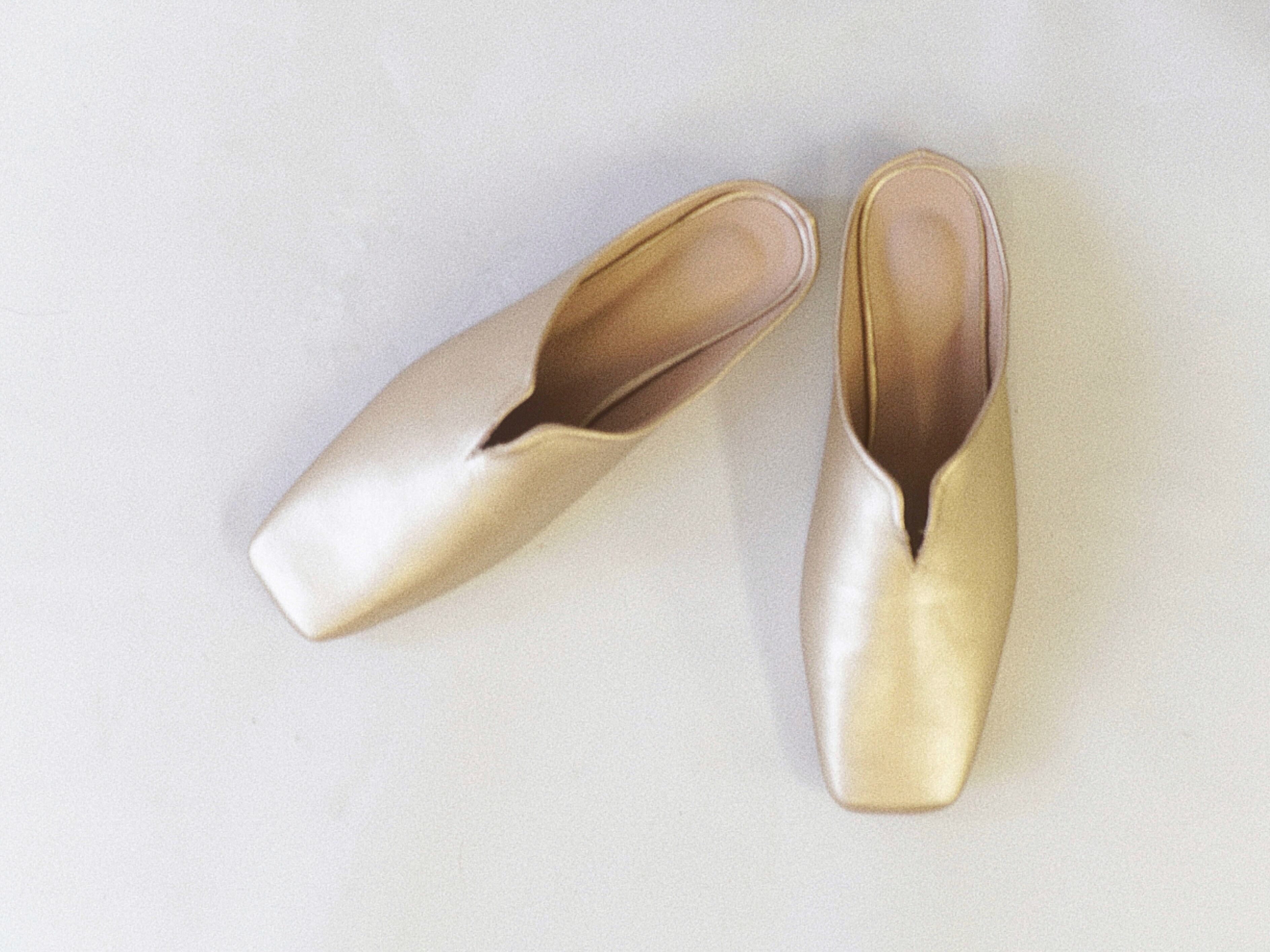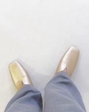 コーデのアクセントになるゴールドスクエアトゥスリッポン