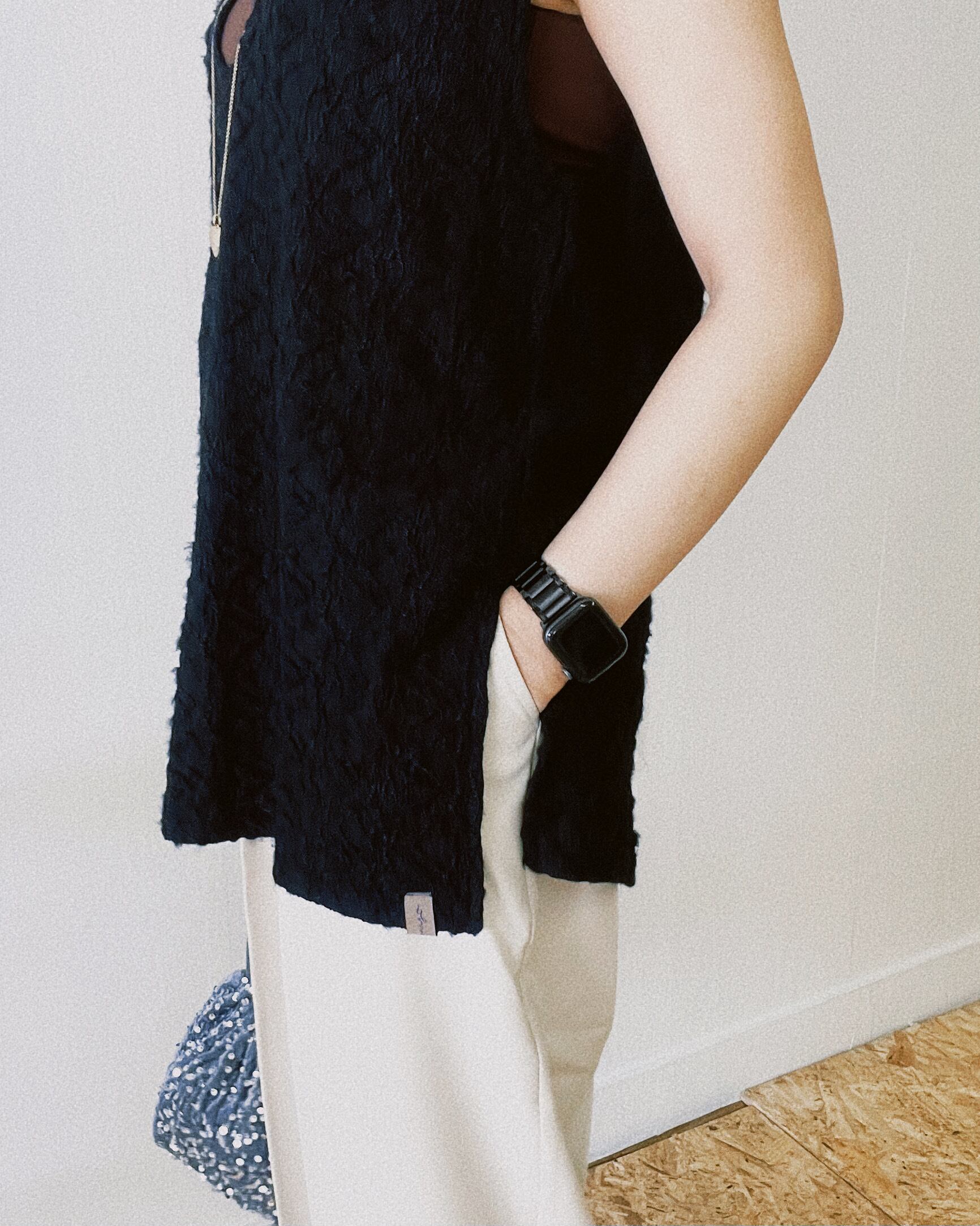 シアージャガード生地を使用したやわらかなロングVネックベスト。