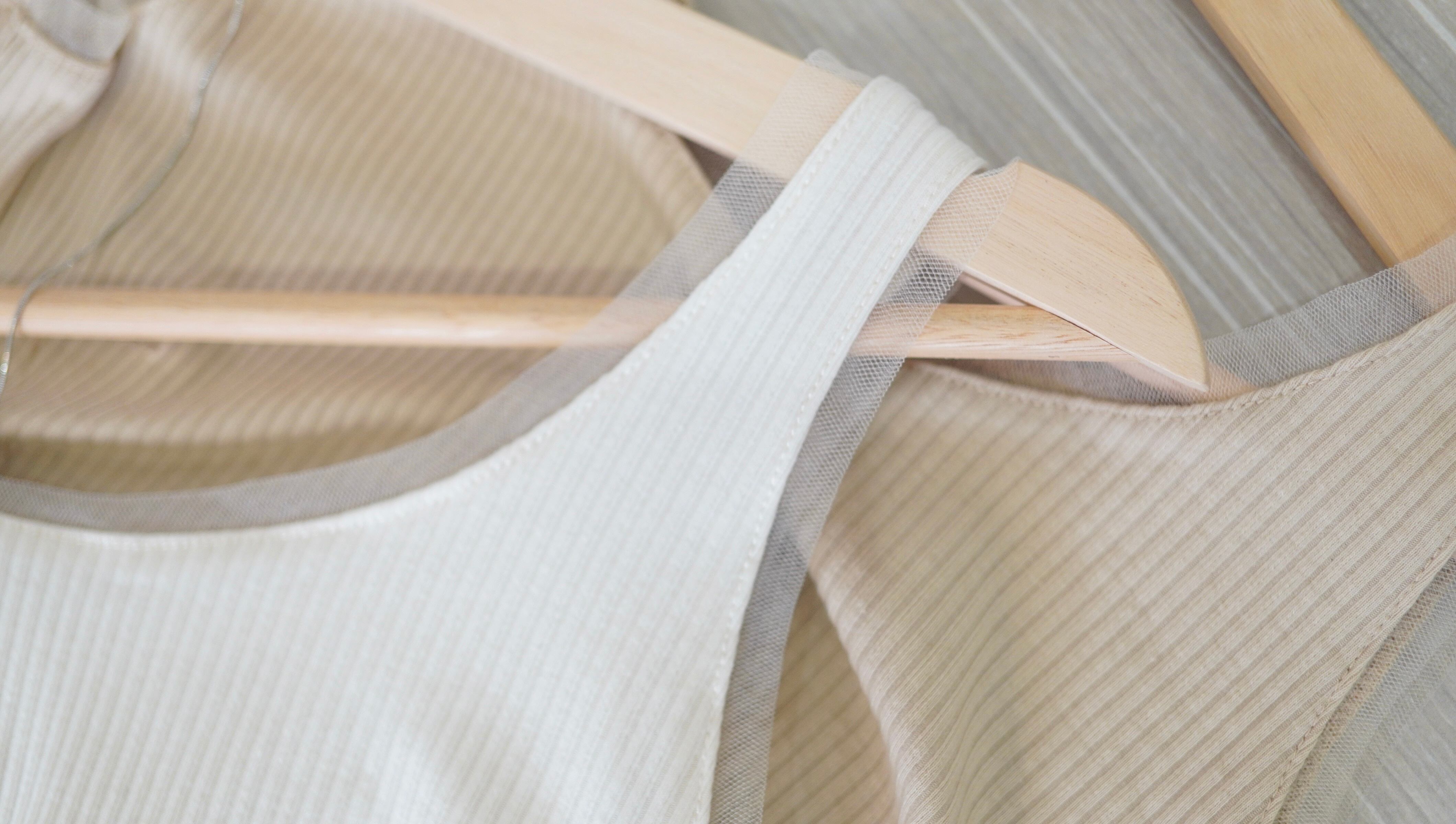 計算された衿ぐりで、インナーに着るとチュール部分がちらっと見えやすいチュールリブタンク。
