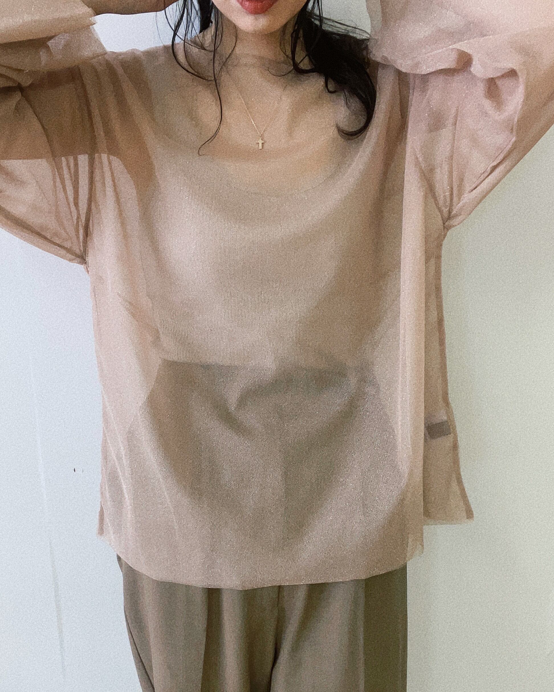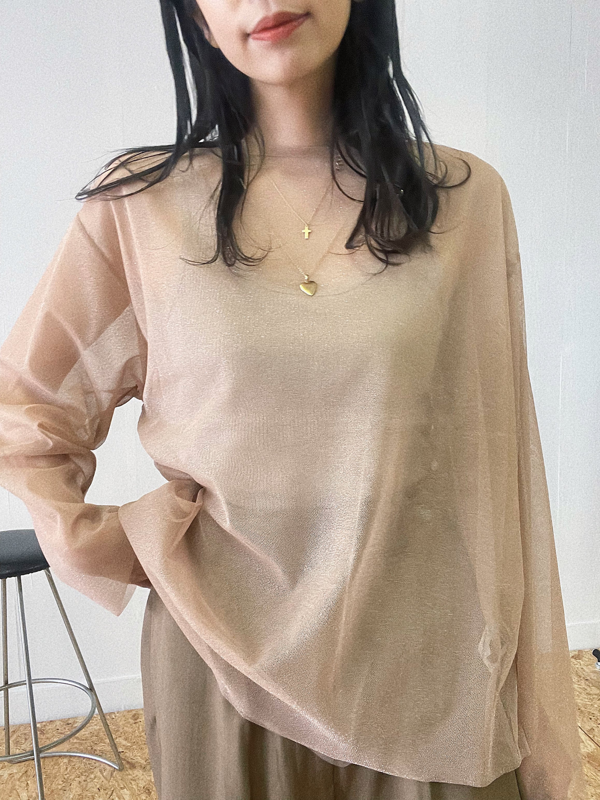 二層仕立てになったルーズシルエットのラメチュールトップス。