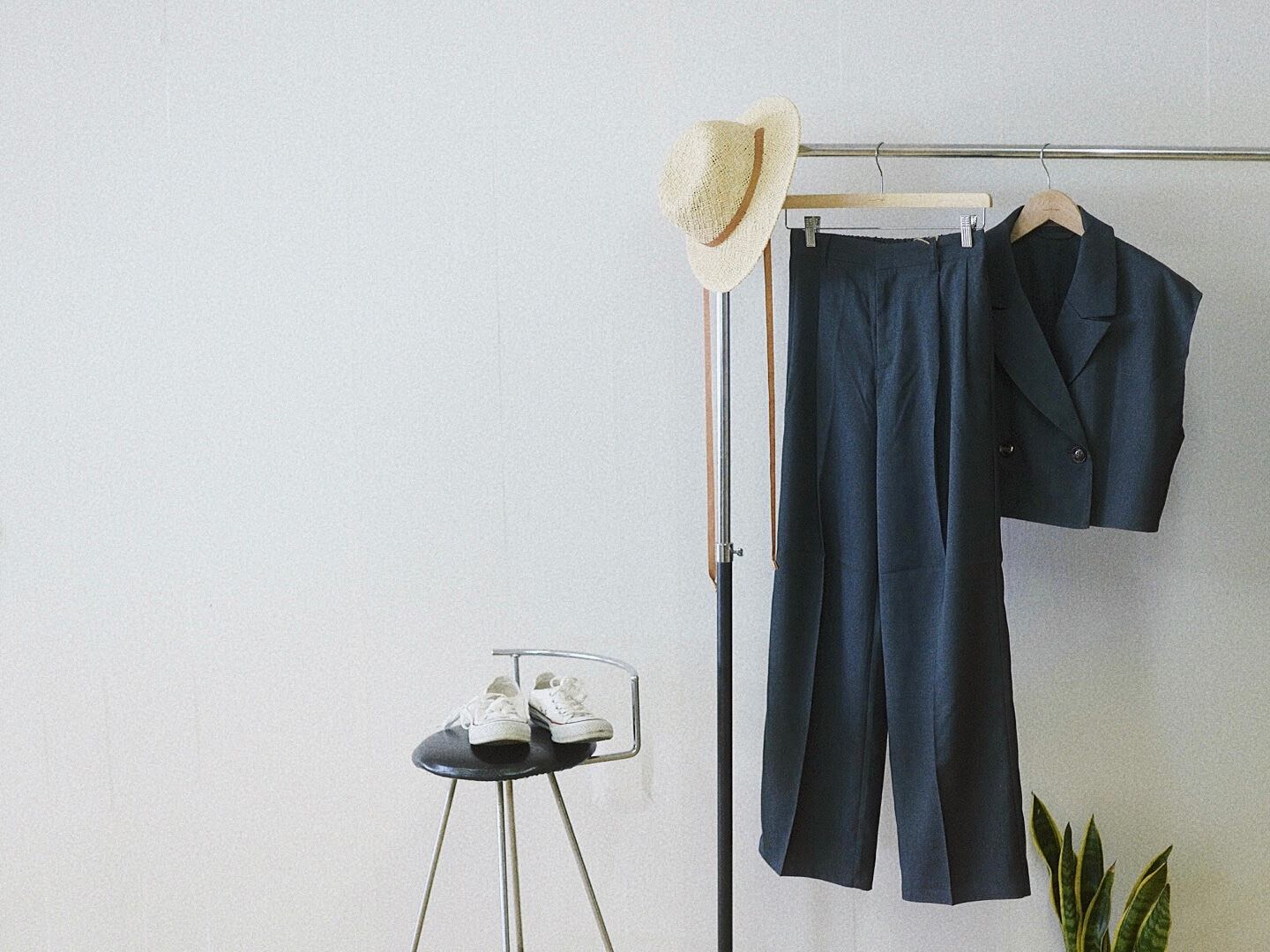同生地のショート丈ジャケットと合わせるとセットアップスタイルに。(チャコールのみ)