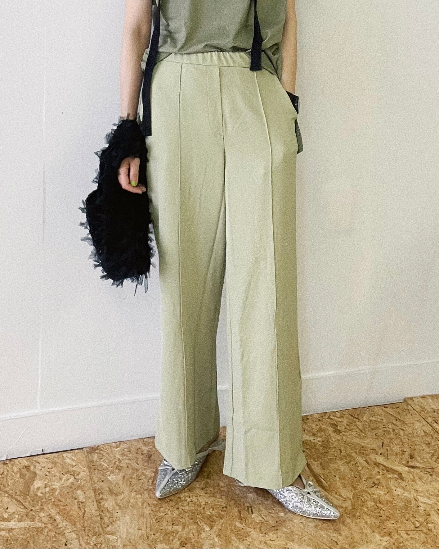 落ち感のある素材でお洗濯してもシワになりにくく、センタープレス入りで脚を長くみせてくれる一本です。