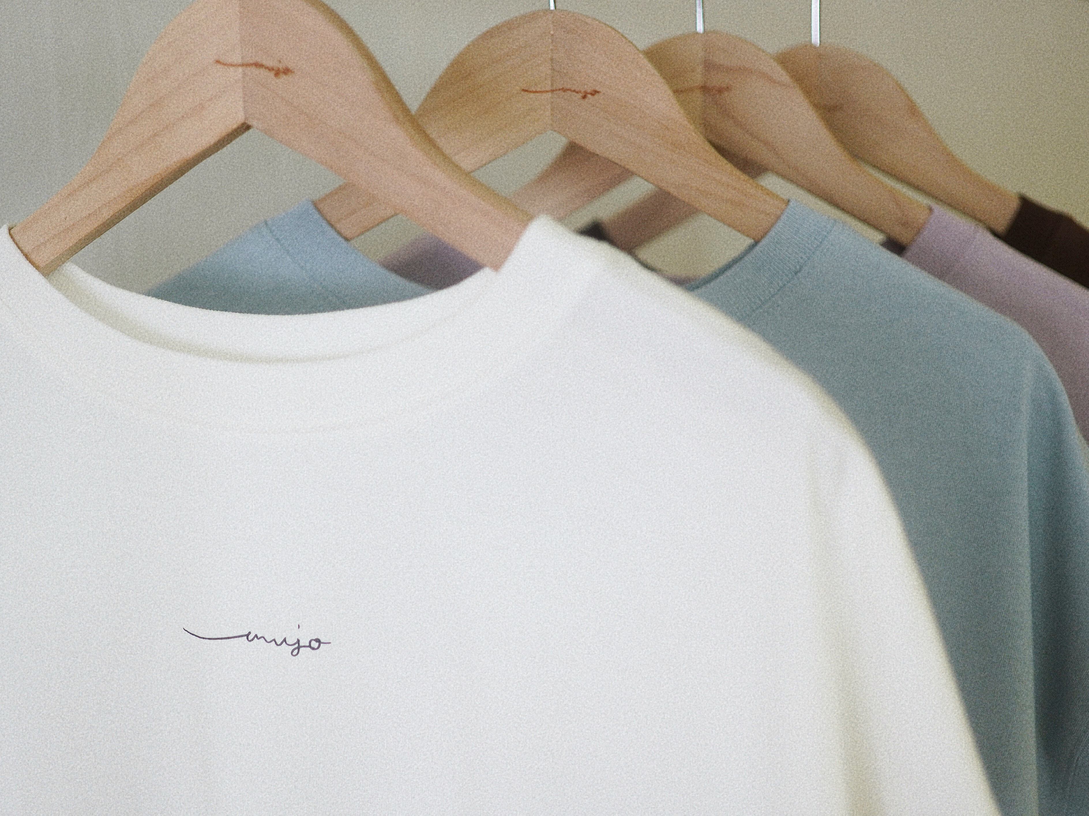 主張しすぎない「mujo」のロゴプリントが、コーデのさり気ないアクセントになります。