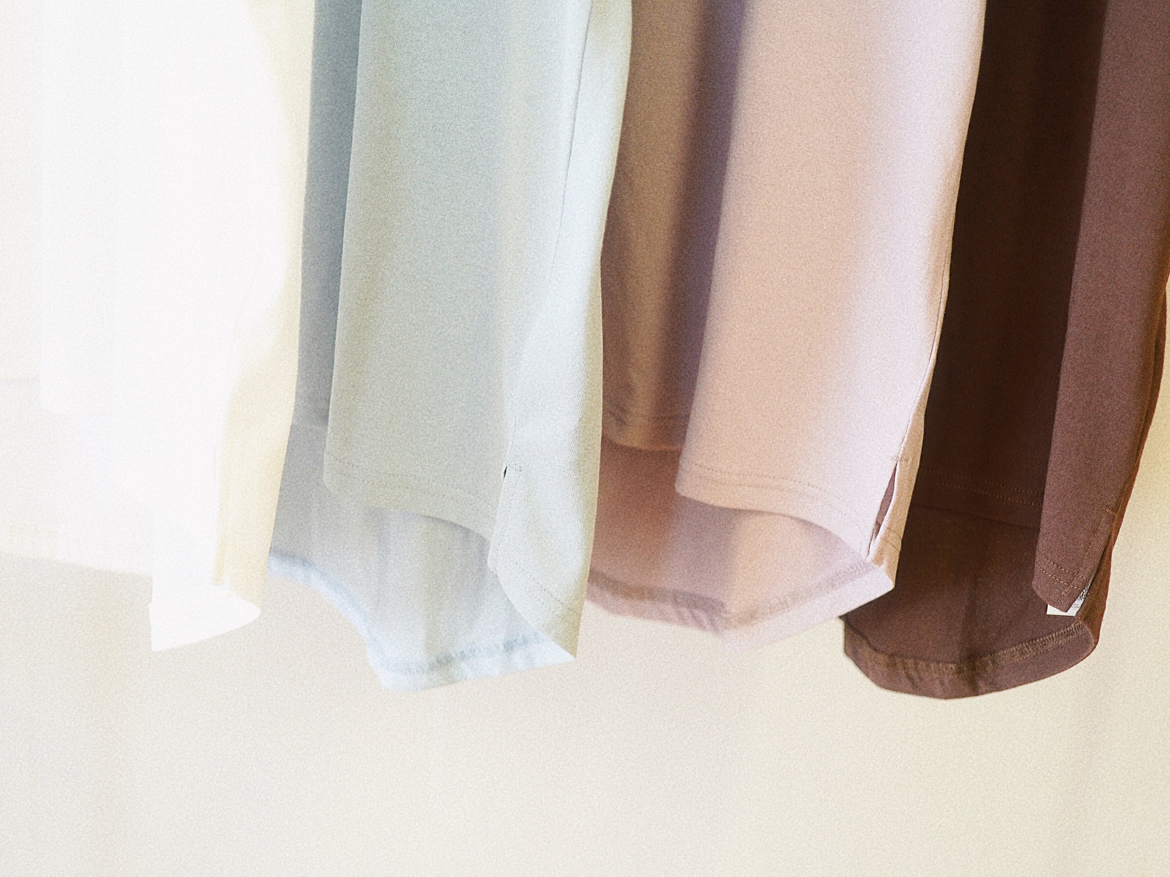 裾が前後差のある後ろロング丈のラウンドシルエットなので、Tシャツを出して着てもバランス良く着こなせます。