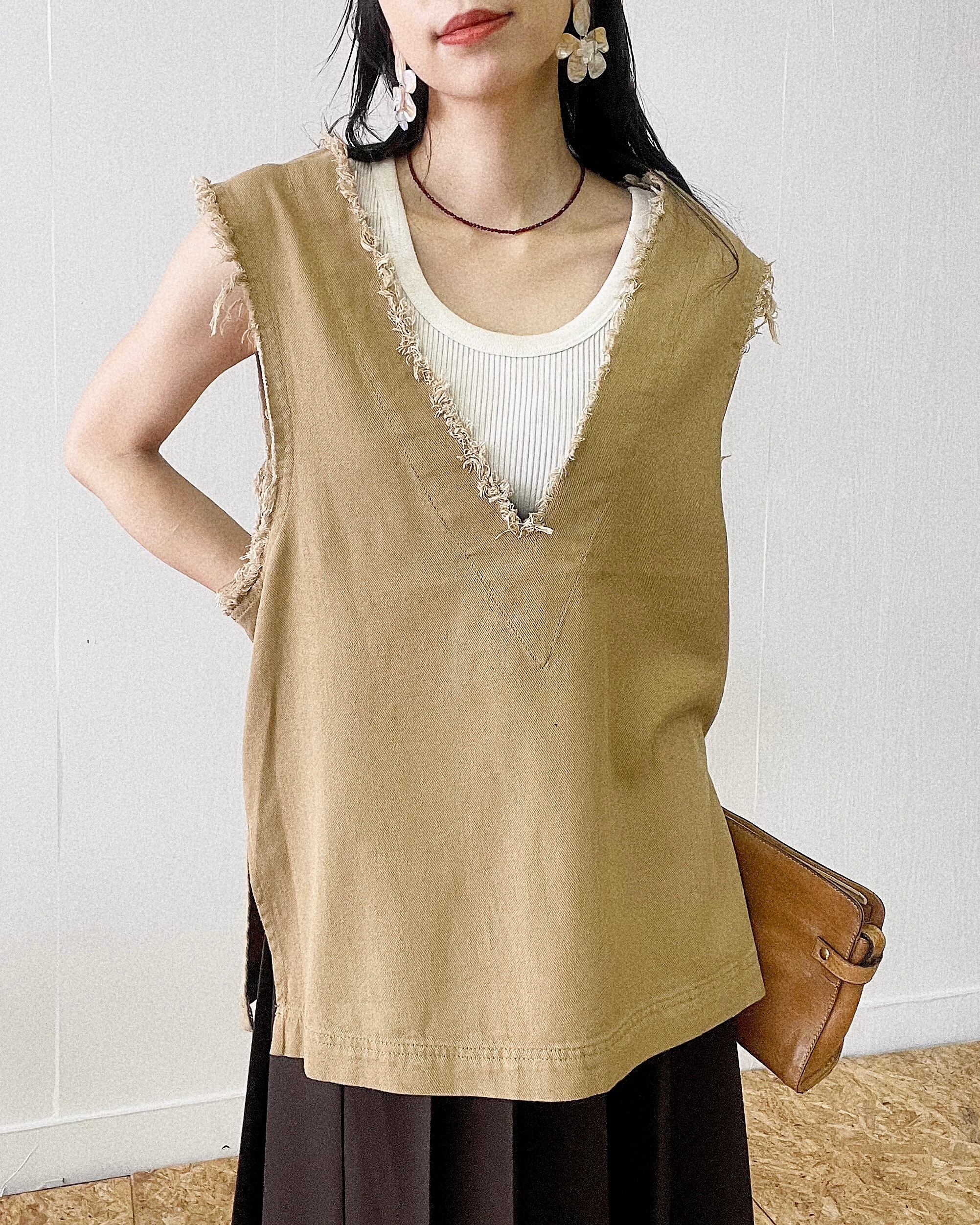 切りっぱなしのフリンジと深めの Vネックが抜け感を演出してくれます。
