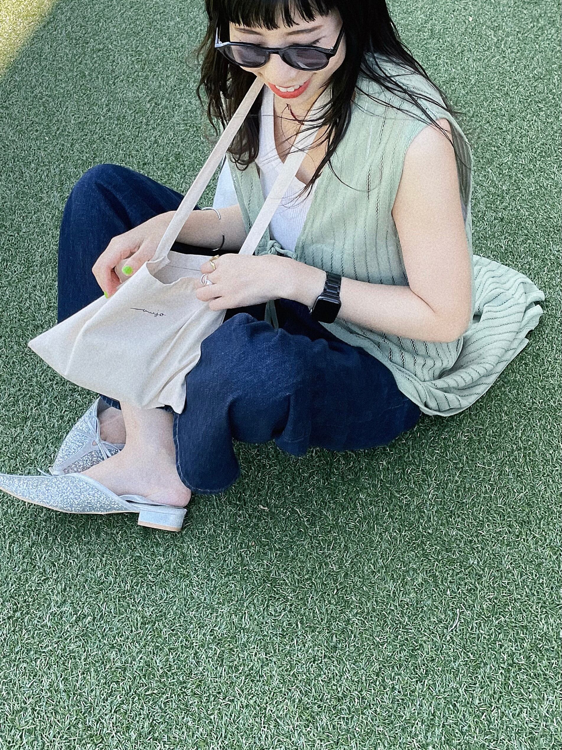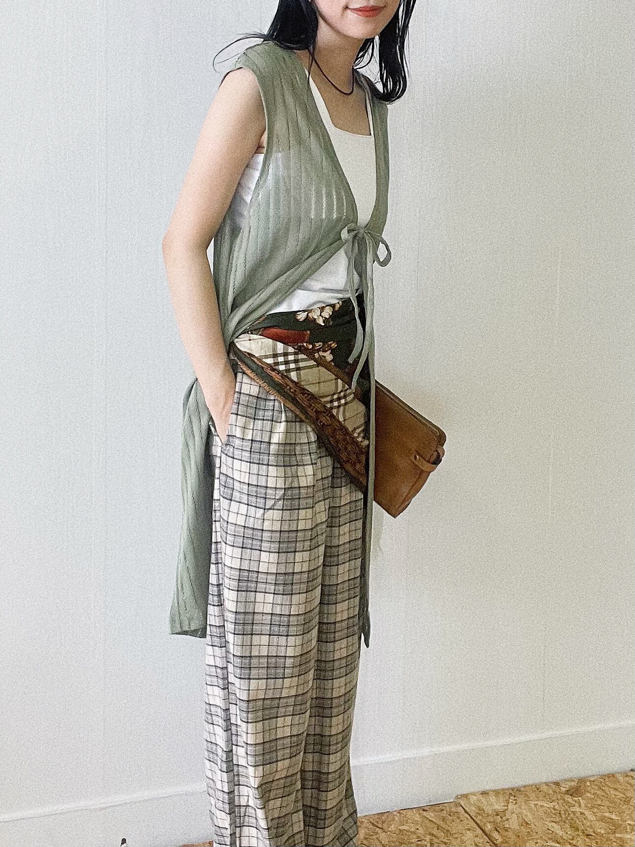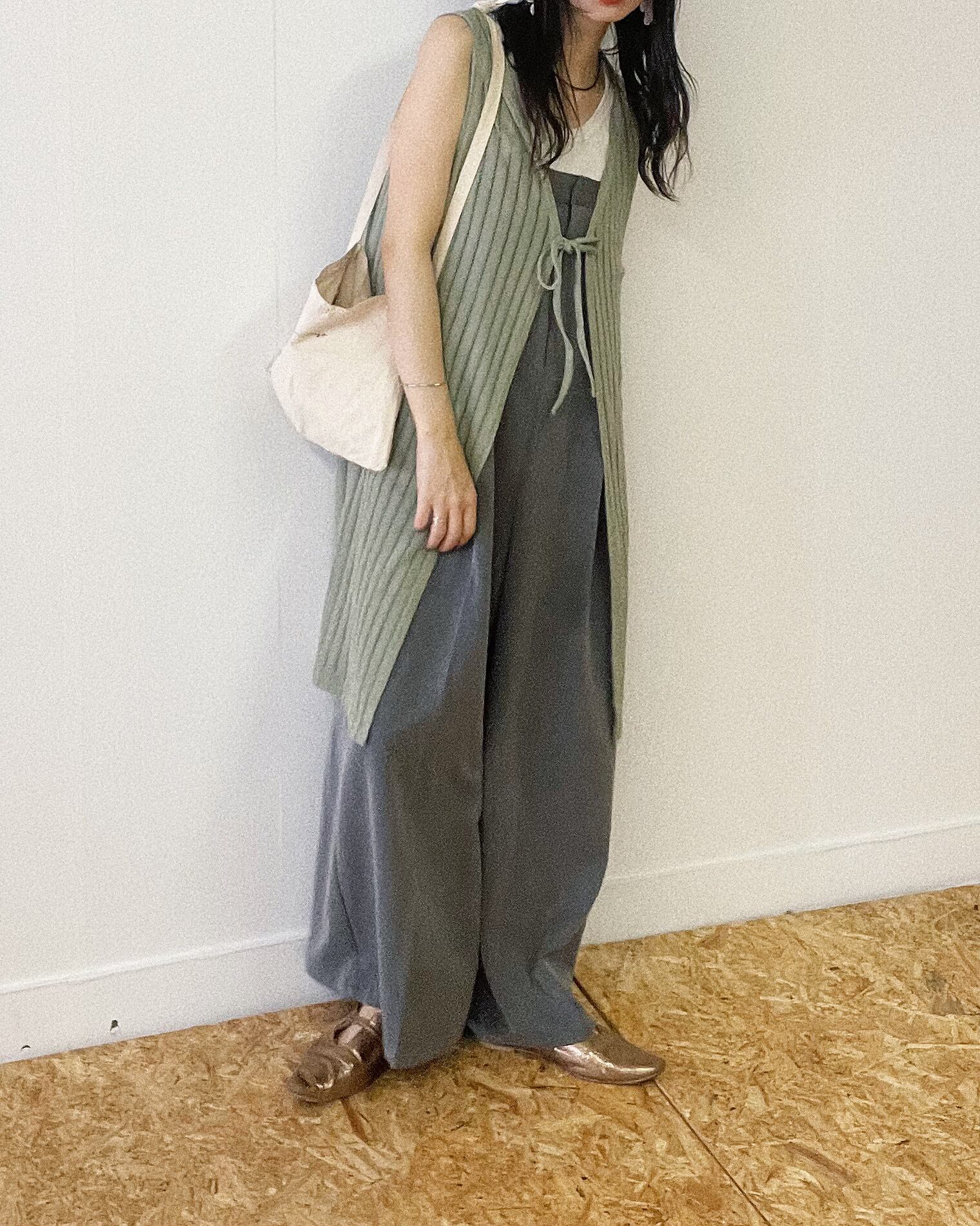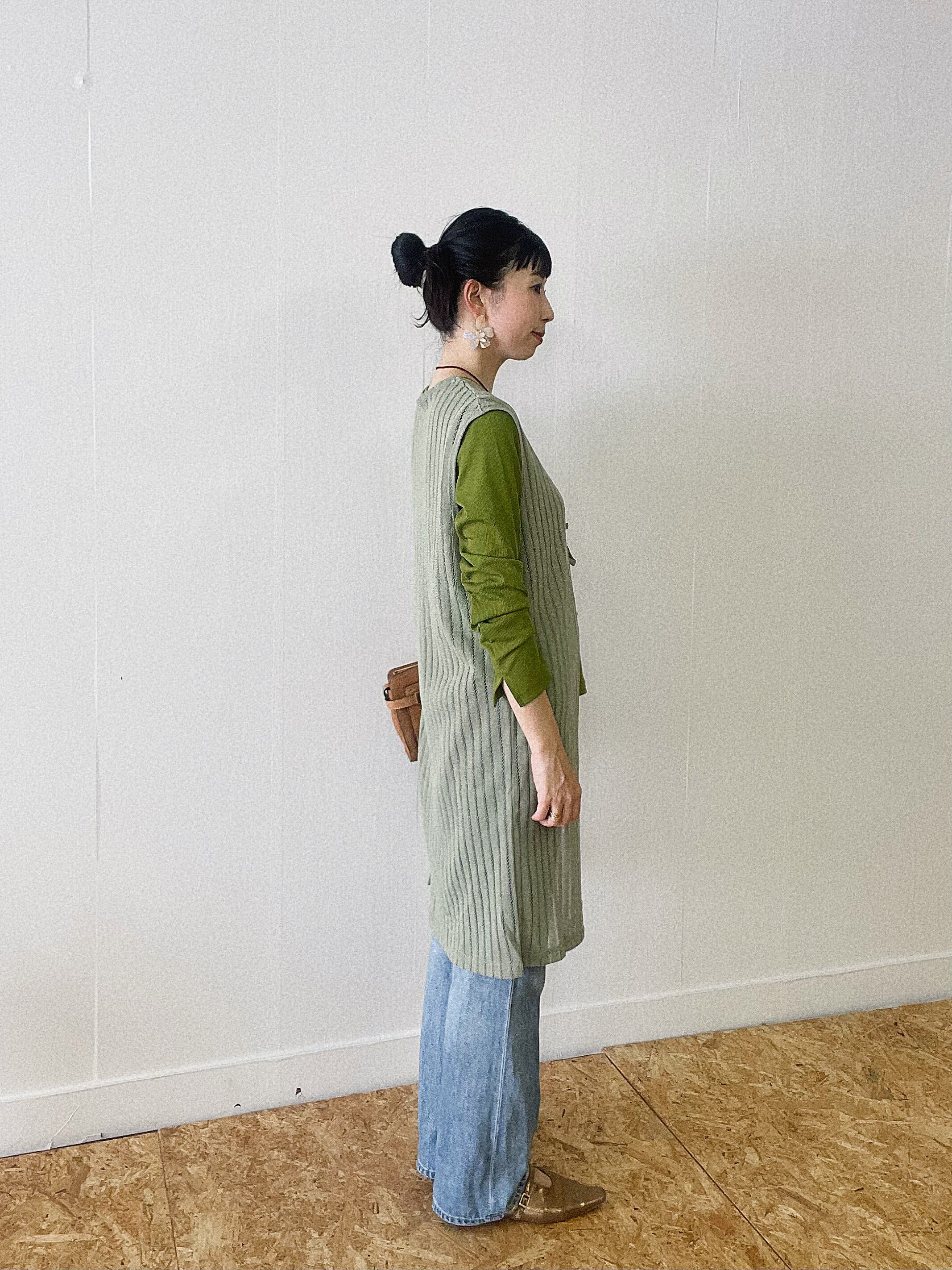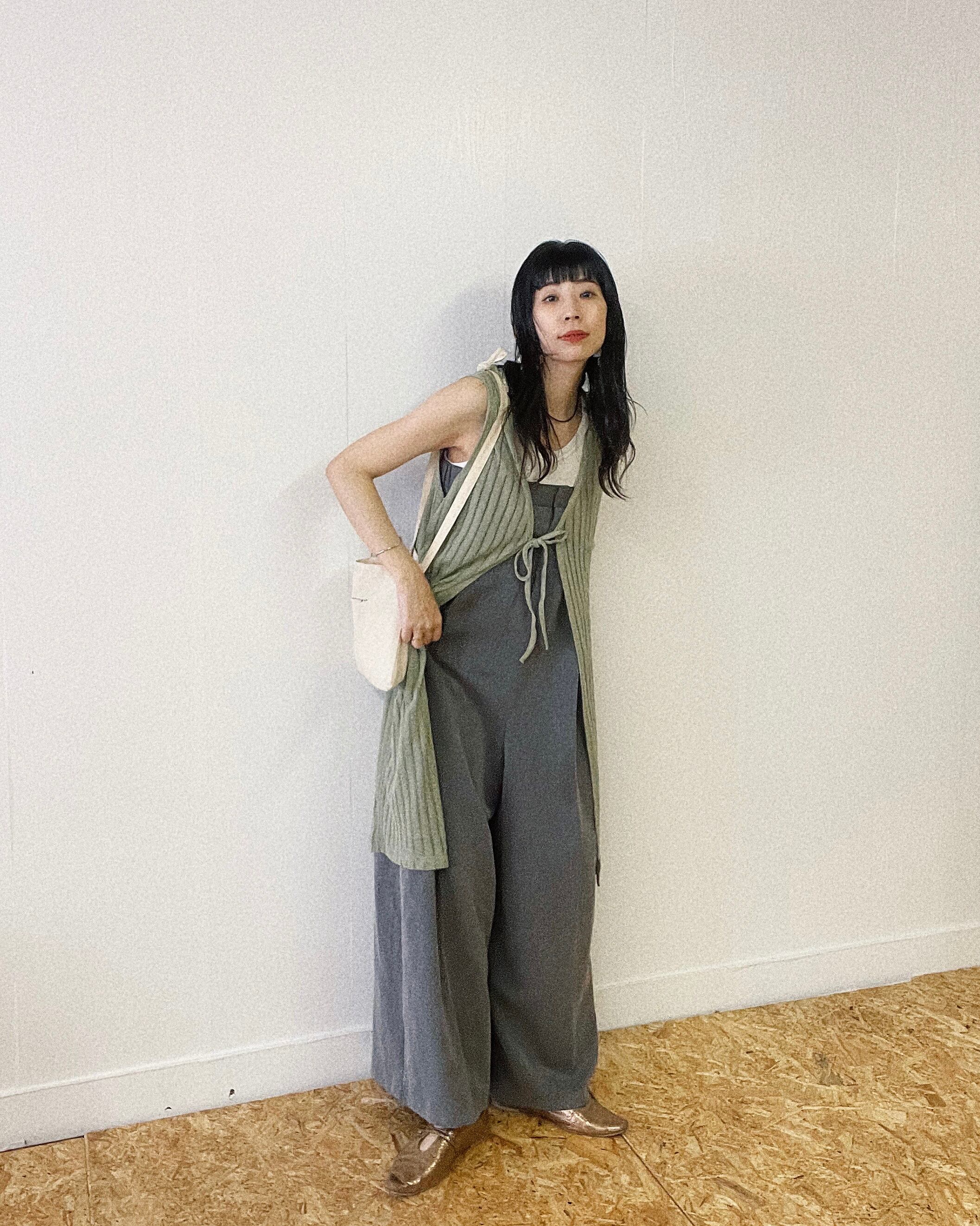 控えめなパステルグリーンがコーデを柔らかくみせてくれます。