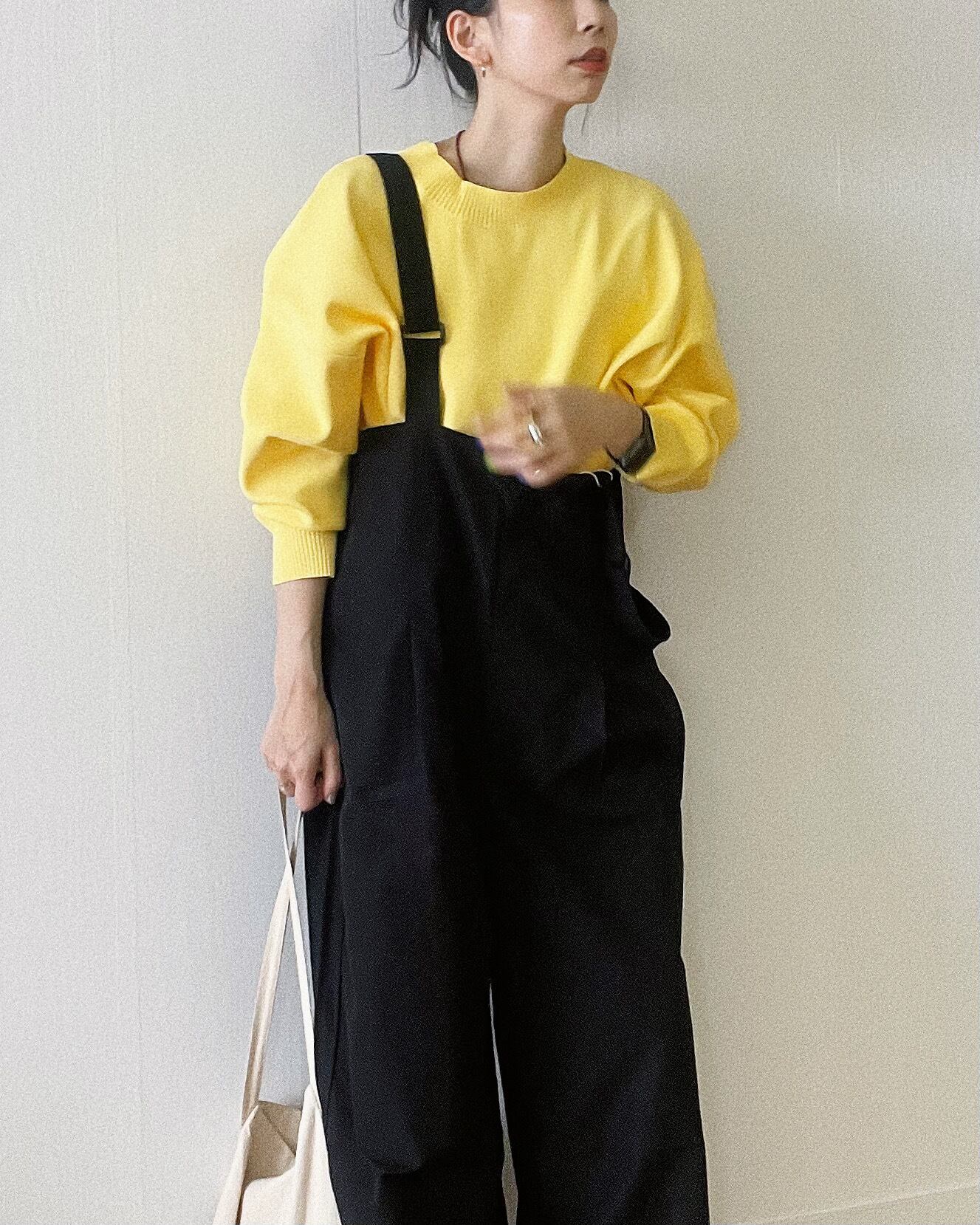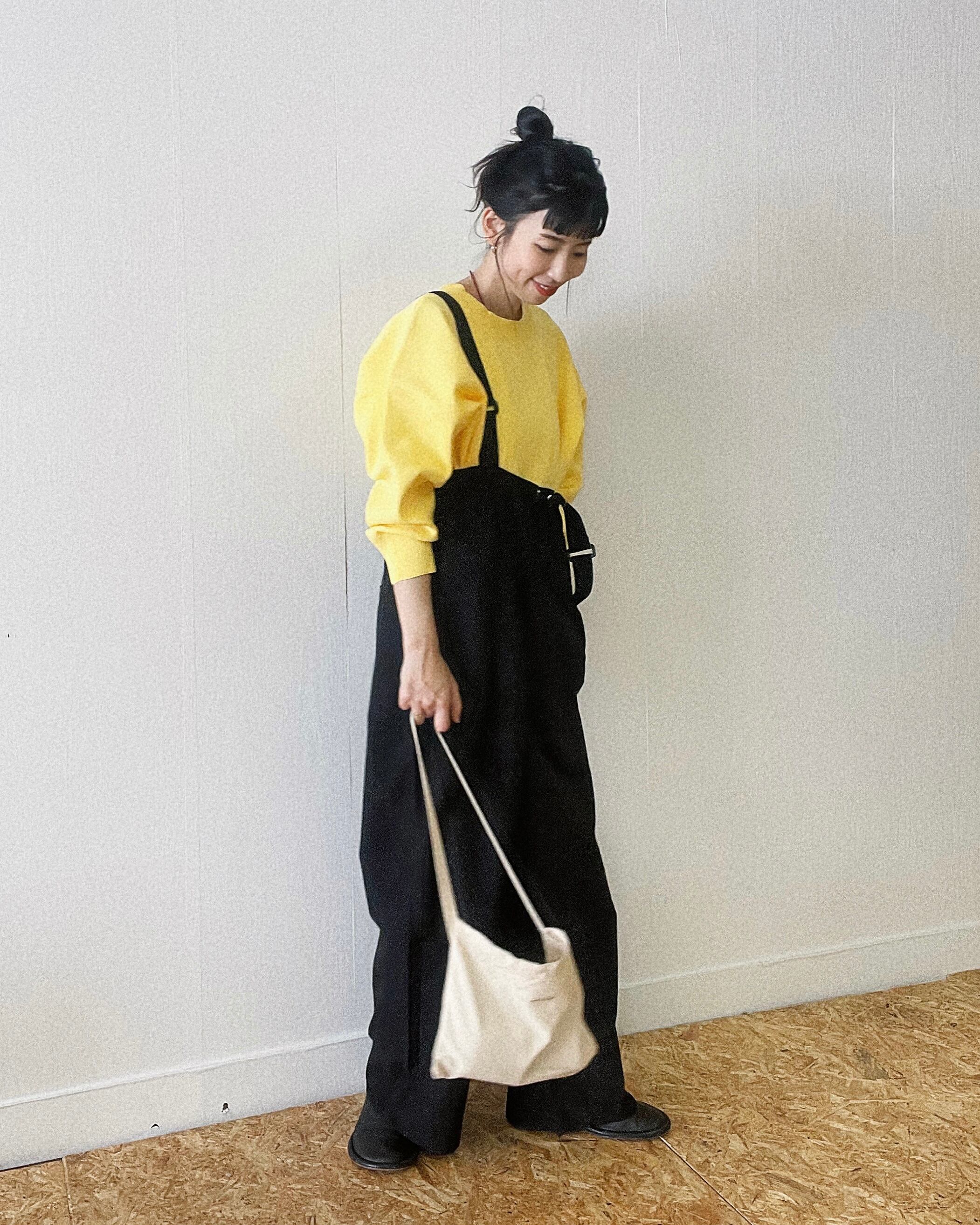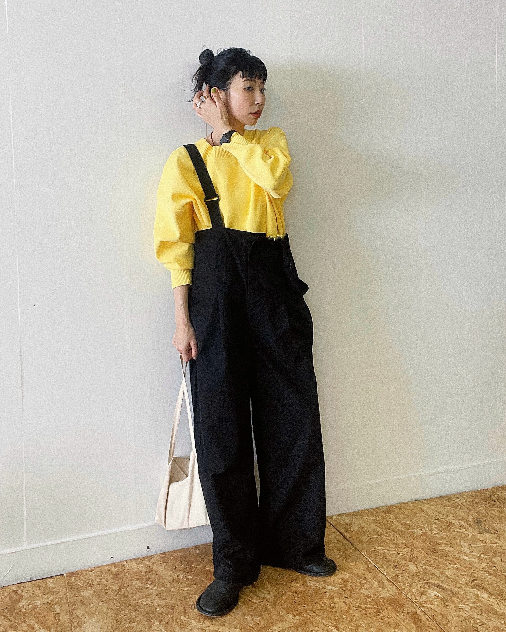 カラーものをコーディネートに一点取り入れるだけで華やかな雰囲気に。