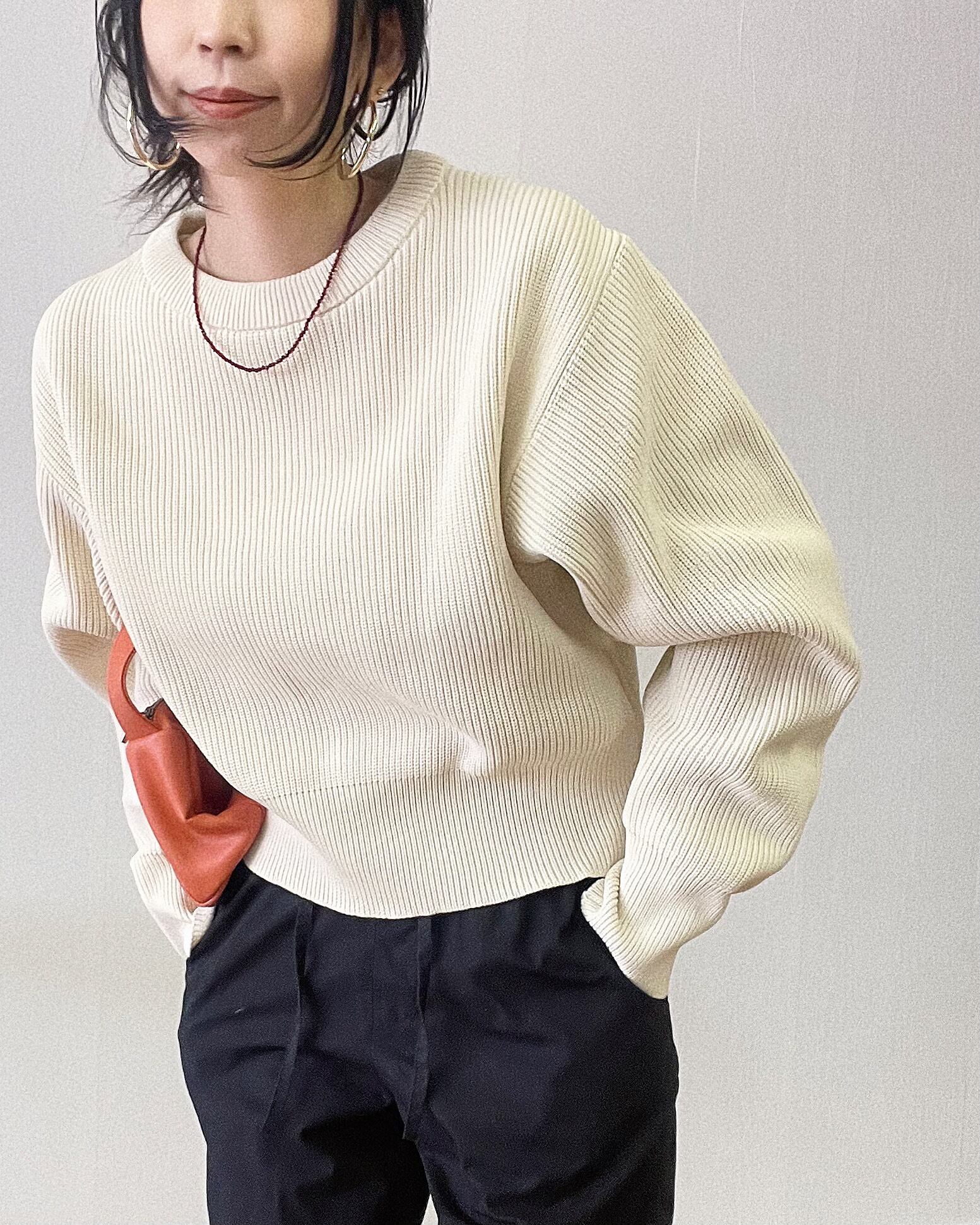 少し短めのクロップド丈なのでハイウエストのボトムスとの相性◎