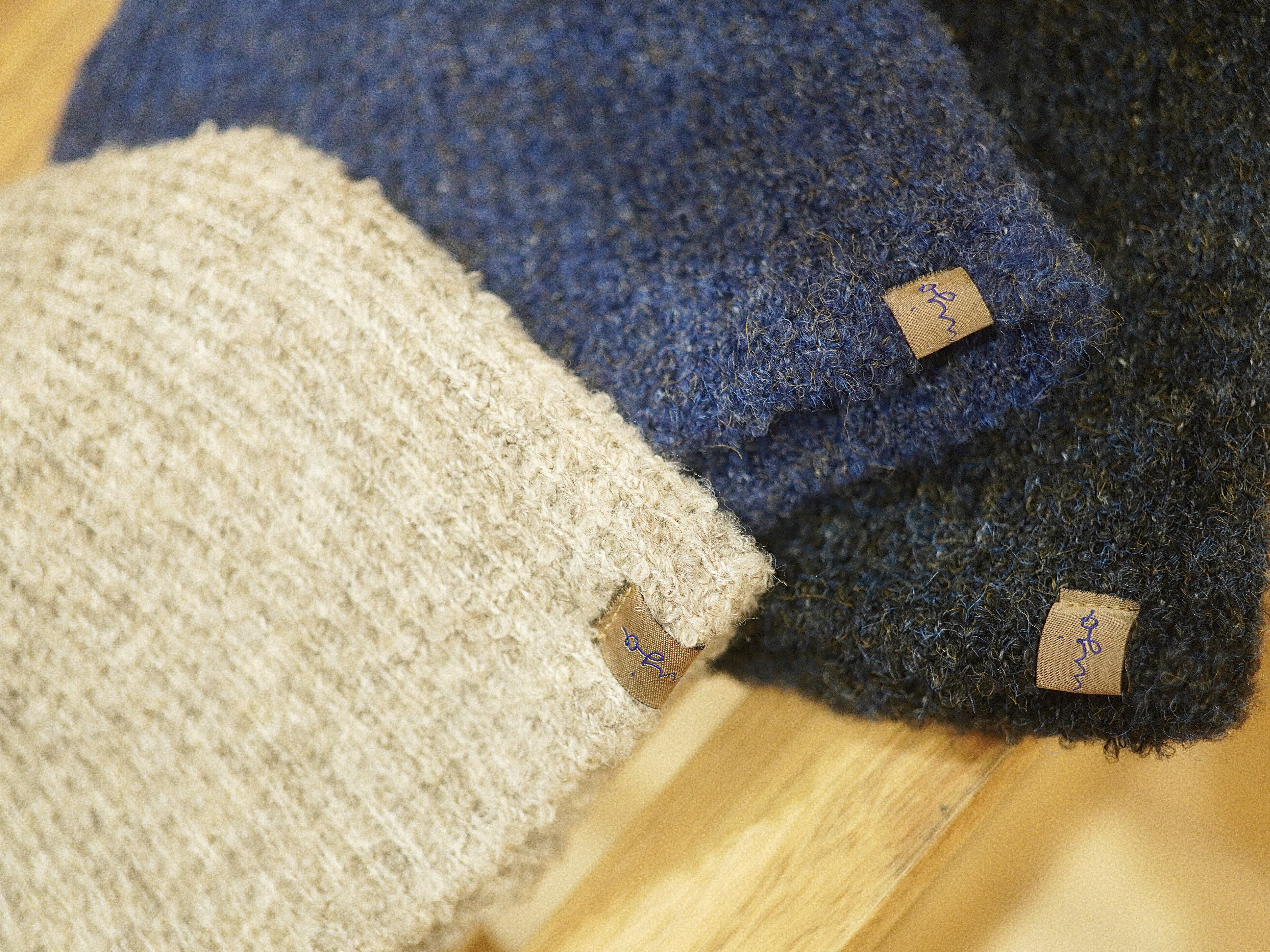 様々な色や太さの異なる糸を組み合わせ、ファンシーヤーンで仕上げたビーニー