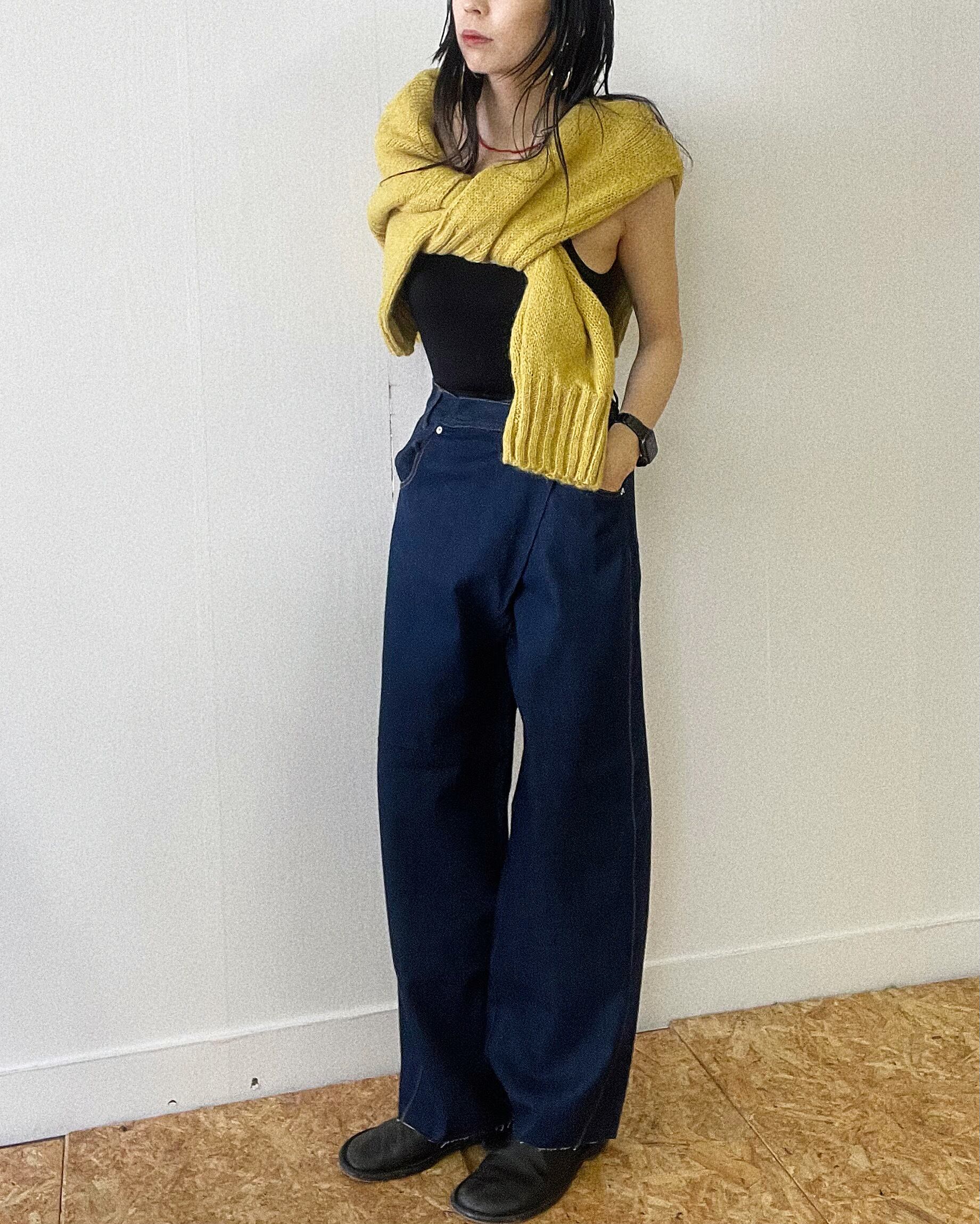 ゆるやかなカーブラインで足のラインを拾いにくくウエスト部分をアシンメトリーに。裾は切りっぱなしでデザイン性をプラスした一本です。