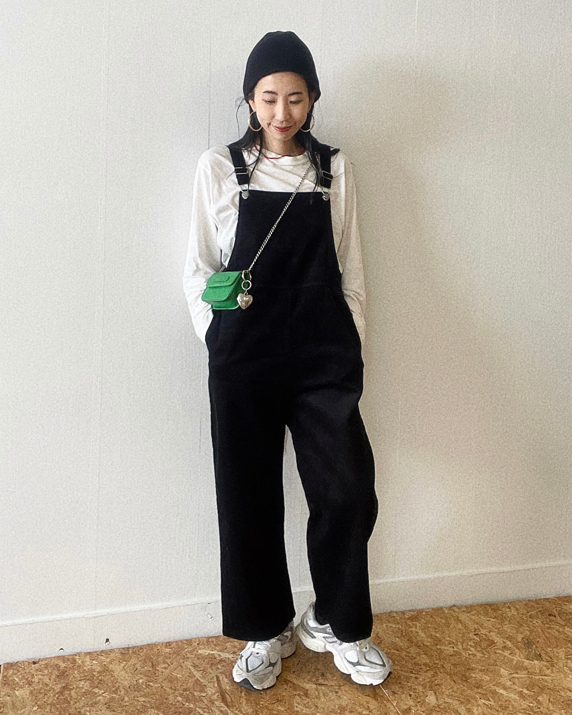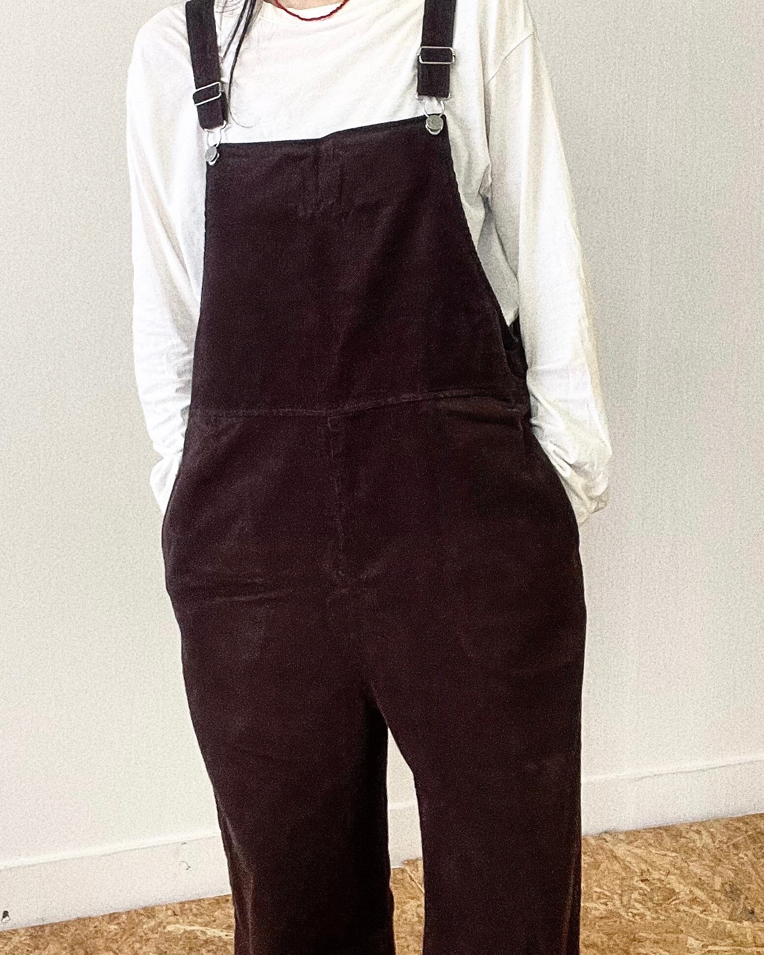 細コールで仕上げたことで上品で落ち着いた印象のコーデュロイサロペットに。