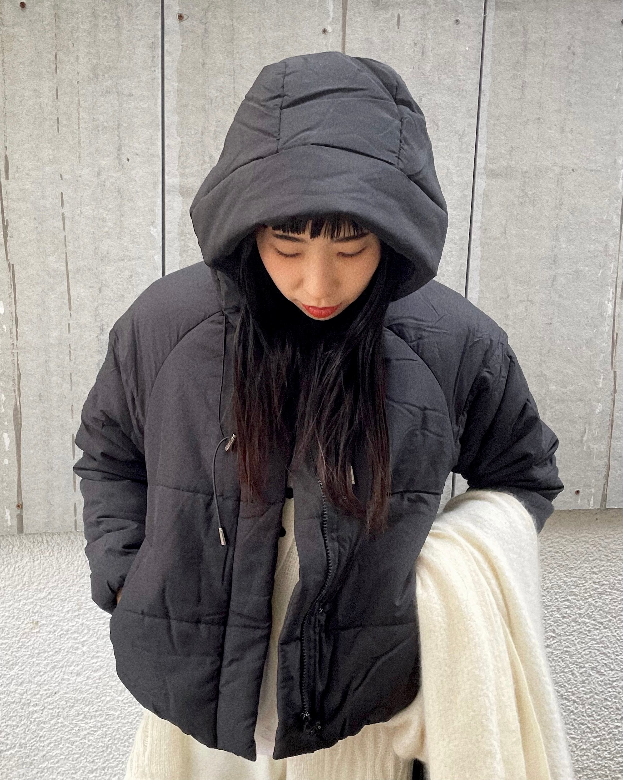 ほどよいボリュームにまるみのあるシルエット、後ろはお尻が半分隠れる程の前後差がある丈感でさっと羽織れる気軽さがあるダウン。
