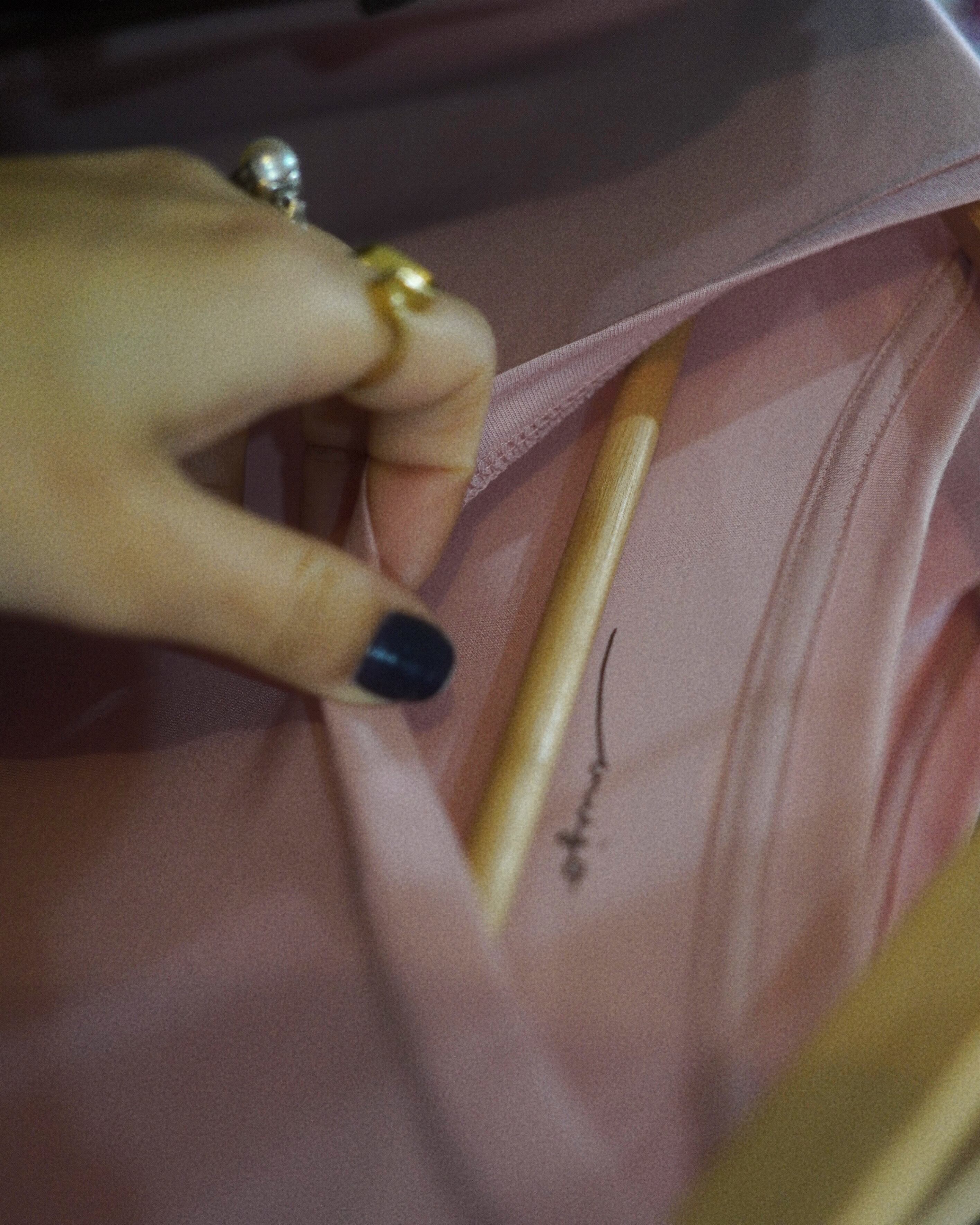 秋冬には、インナーアイテムとしてさり気なくピンクをポイントにしたスタイルがおすすめ。