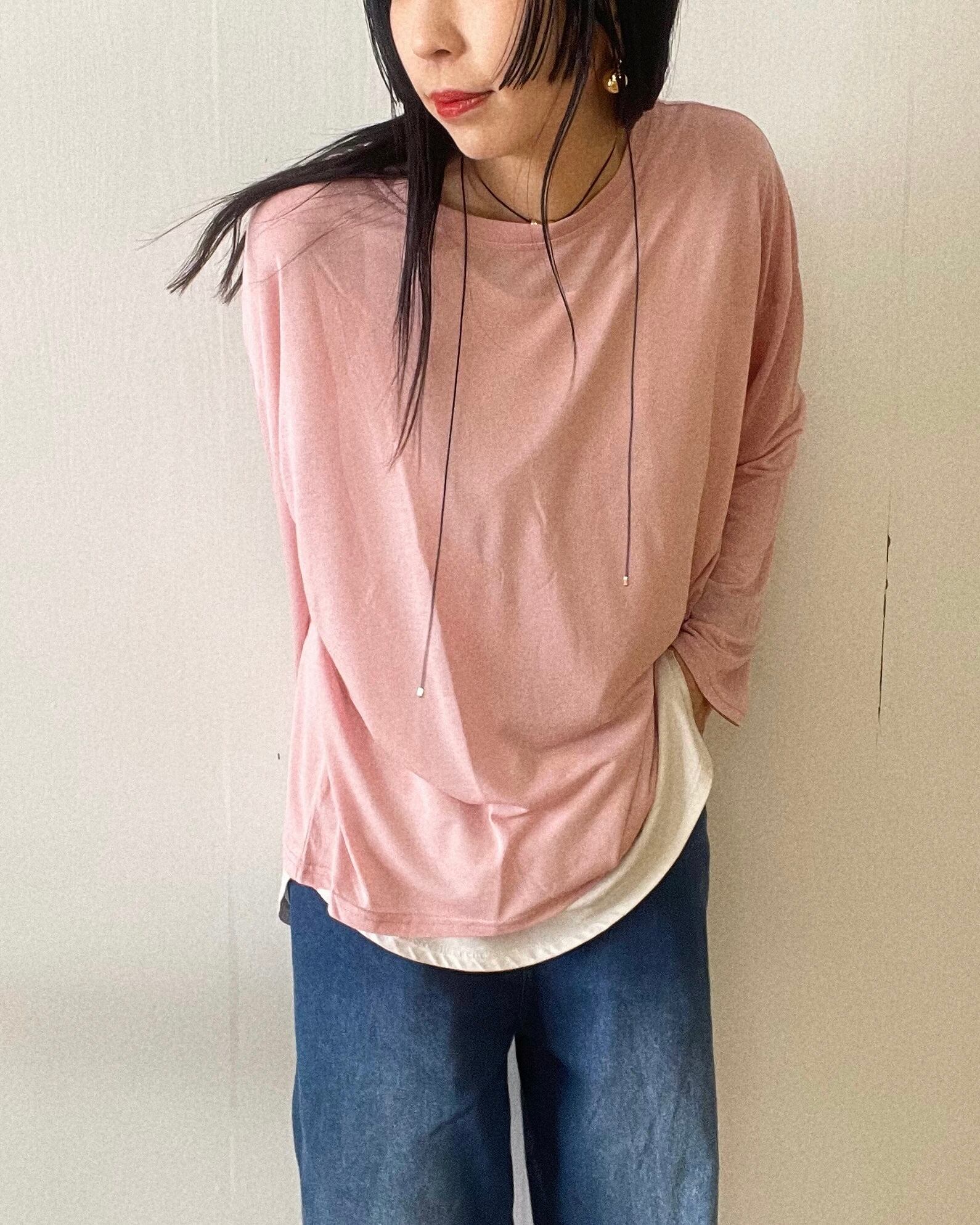 重ね着しやすいサイズ感、透けすぎない程よいシアー素材はインナーも選びやすくシンプルデザインはどんなアイテムとも相性抜群。