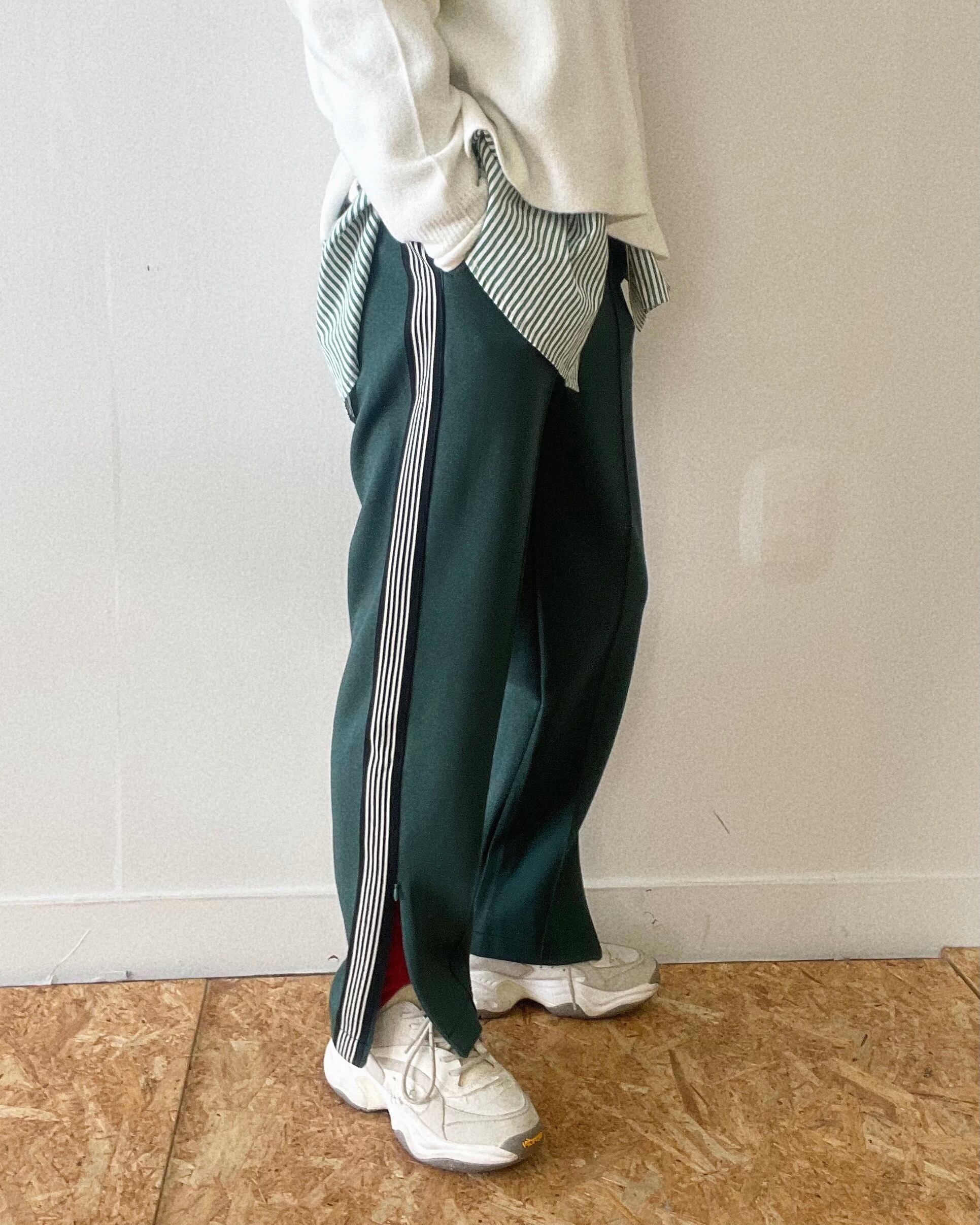 裾にはジッパー付きのスリット、センタープレス加工が施されているので足のラインをスッキリとみせてくれます。